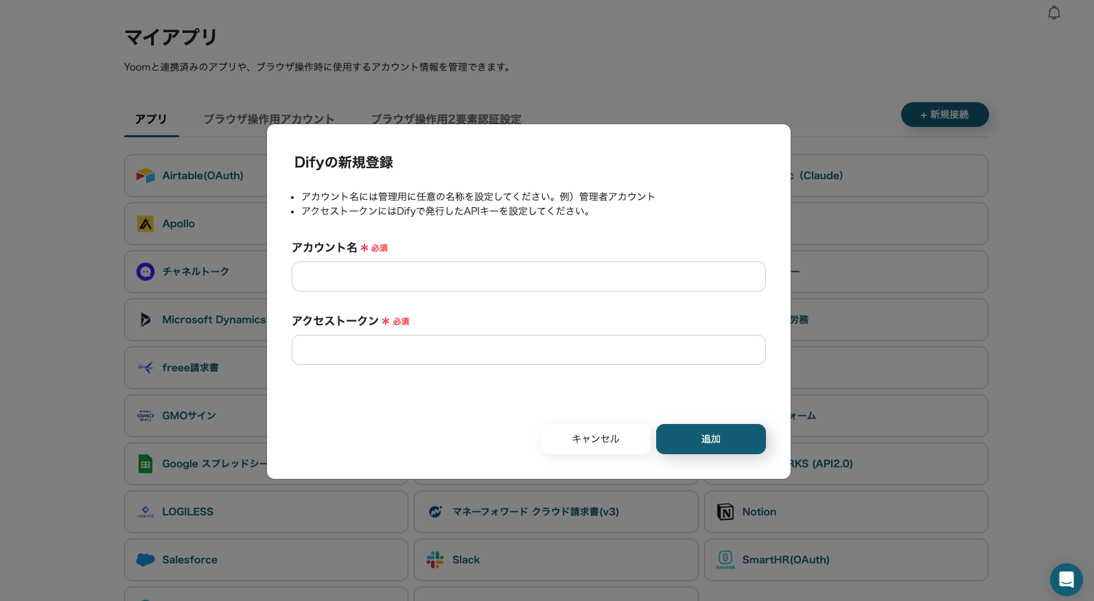 設定後に、「追加」をクリックすると、Difyのマイアプリ連携が完了します。