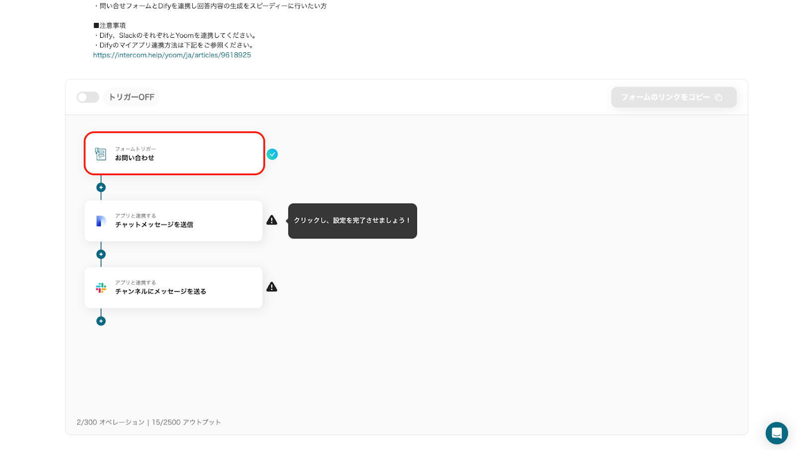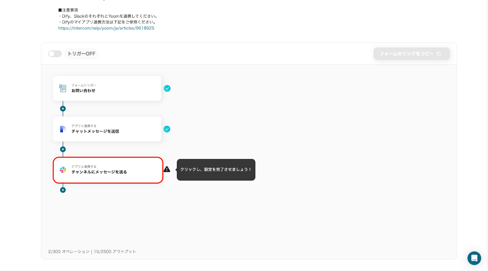 最後に「トリガーをON」をクリックし、フロー稼働の準備が完了です。これで、フォームにお問い合わせがあったら、回答内容をDifyで作成してSlackに通知します。