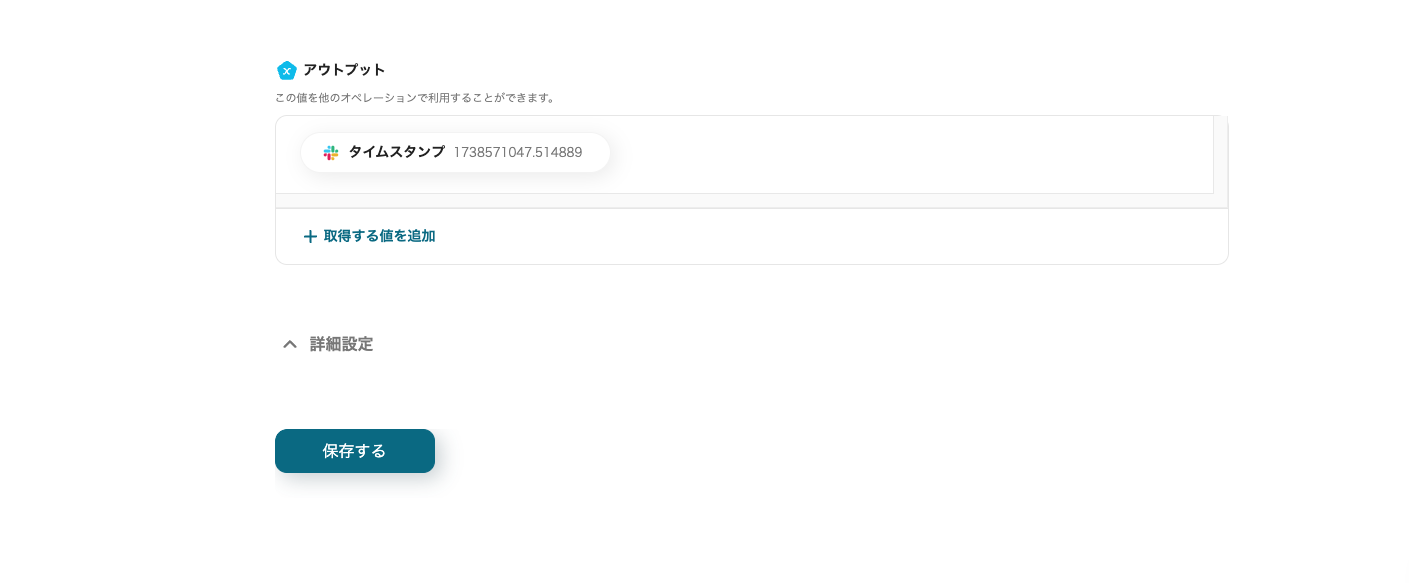 アウトプットに表示された情報と、Slackにメッセージが投稿されたことを確認し、「保存する」をクリックしてください。
