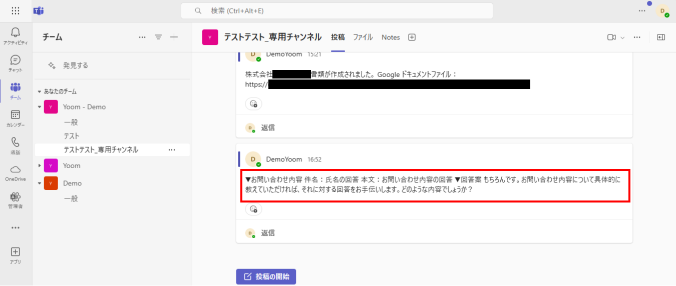 その他、メンションで発信したい場合は「メンション情報」を、資料を添付したい場合は「添付ファイル情報」を入力してください。 すべて入力が完了したら、「テスト」を押します。 テストが成功しMicrosoft Teamsにデータが反映されているか確認しましょう。 下記画像の赤枠のように投稿した内容が反映されていれば完了です。 最後に、Yoom画面に戻り「保存」を押してください。