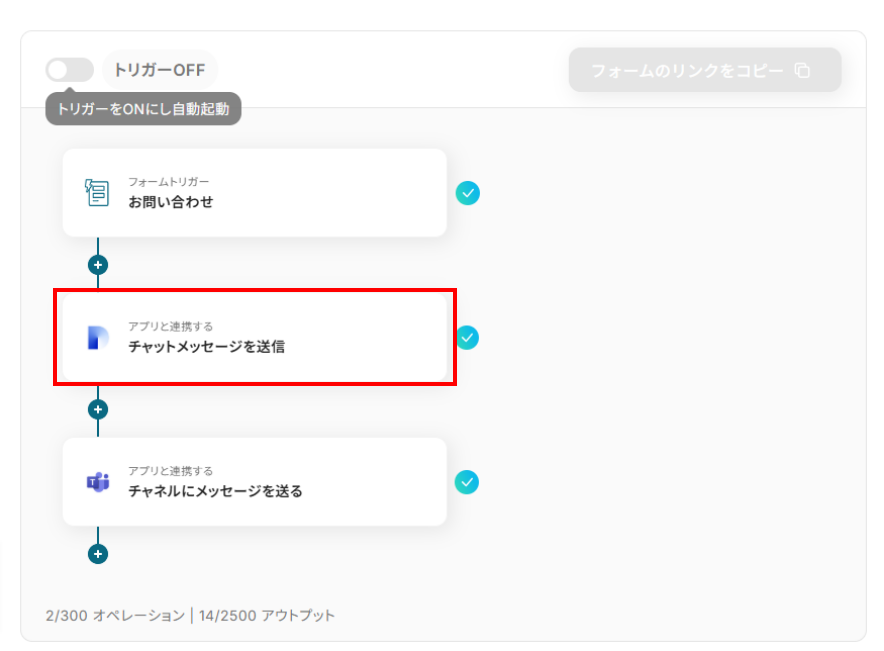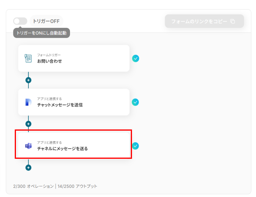 今回はフォームにお問い合わせがあったら、回答内容をDifyで作成してMicrosoft Teamsに通知するフローボットを作成していきます! 作成の流れは大きく分けて以下です。