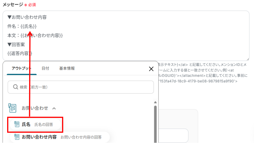 メッセージ:メッセージ入力欄をクリックすると、先ほどと同じようにアウトプットが表示されます。下記画像のようにMicrosoft Teamsに通知したい内容カスタマイズしてください。