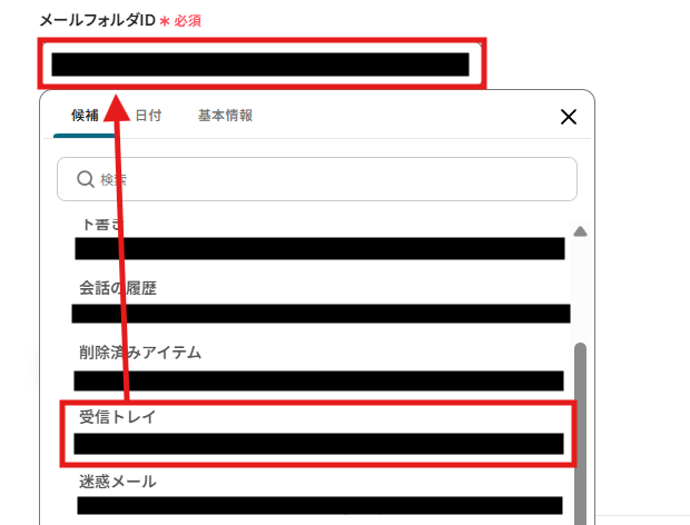 「候補」に連携したアカウント内にあるメールフォルダのリストが表示されるので、適切なものを選択しましょう。