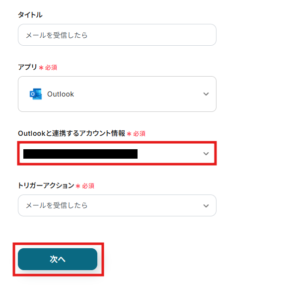 (2)「Outlookと連携するアカウント情報」で、連携したOutlookのアカウントを選択し、「次へ」をクリックします。