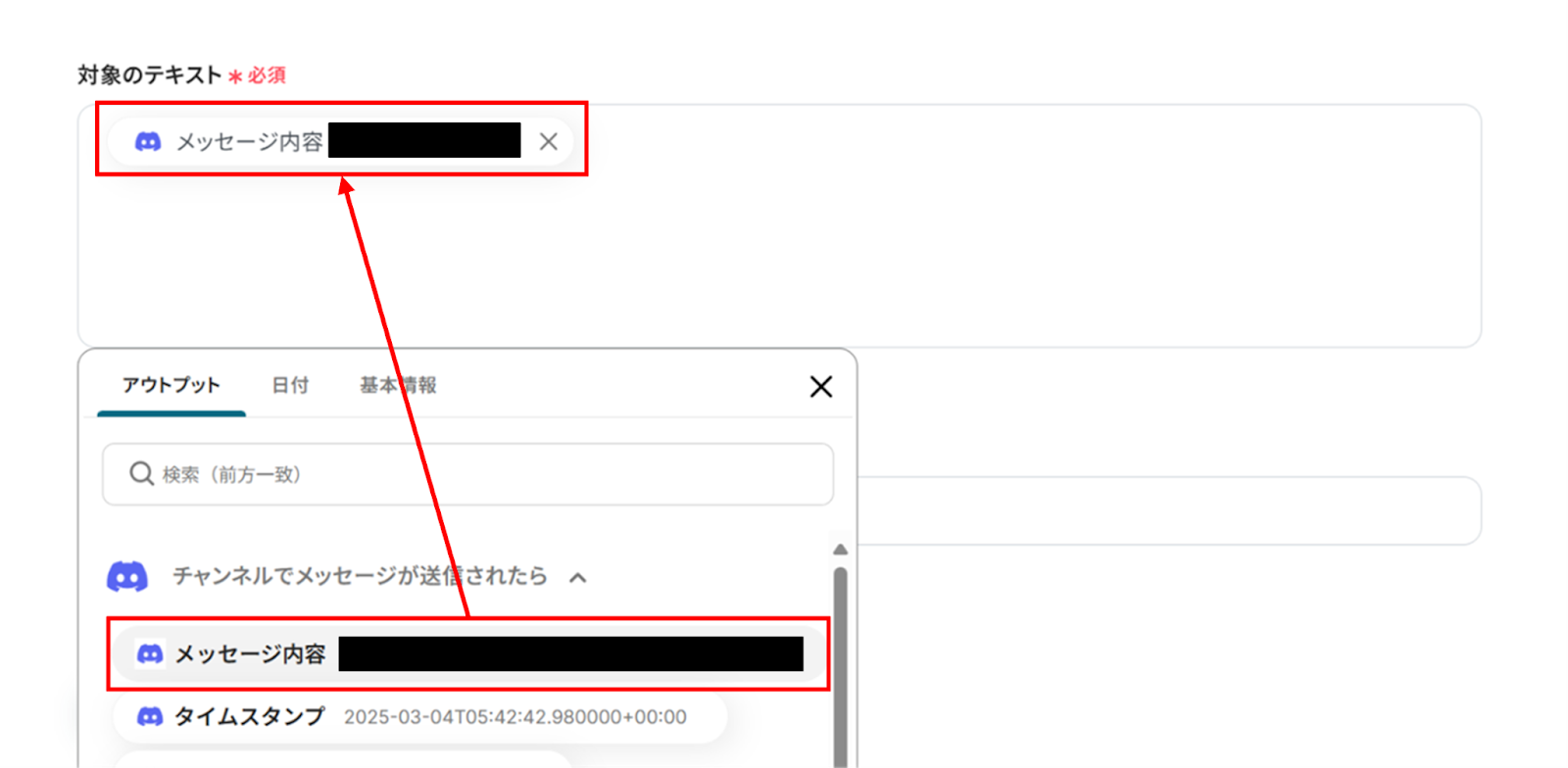 (3)「詳細を設定」画面から、「対象のテキスト」をアウトプットを使って入力します。
