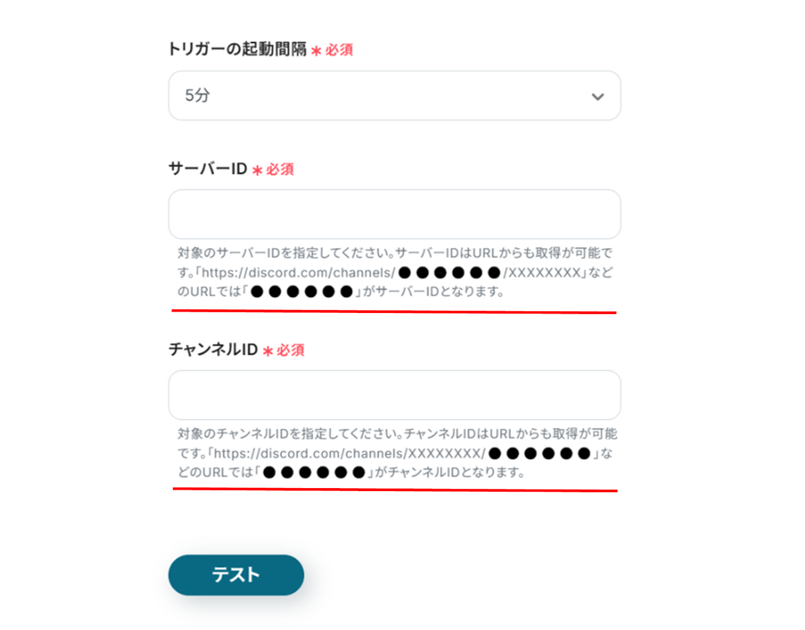 下へ進み、赤線を確認の上、サーバーID、チャンネルIDを入力します。