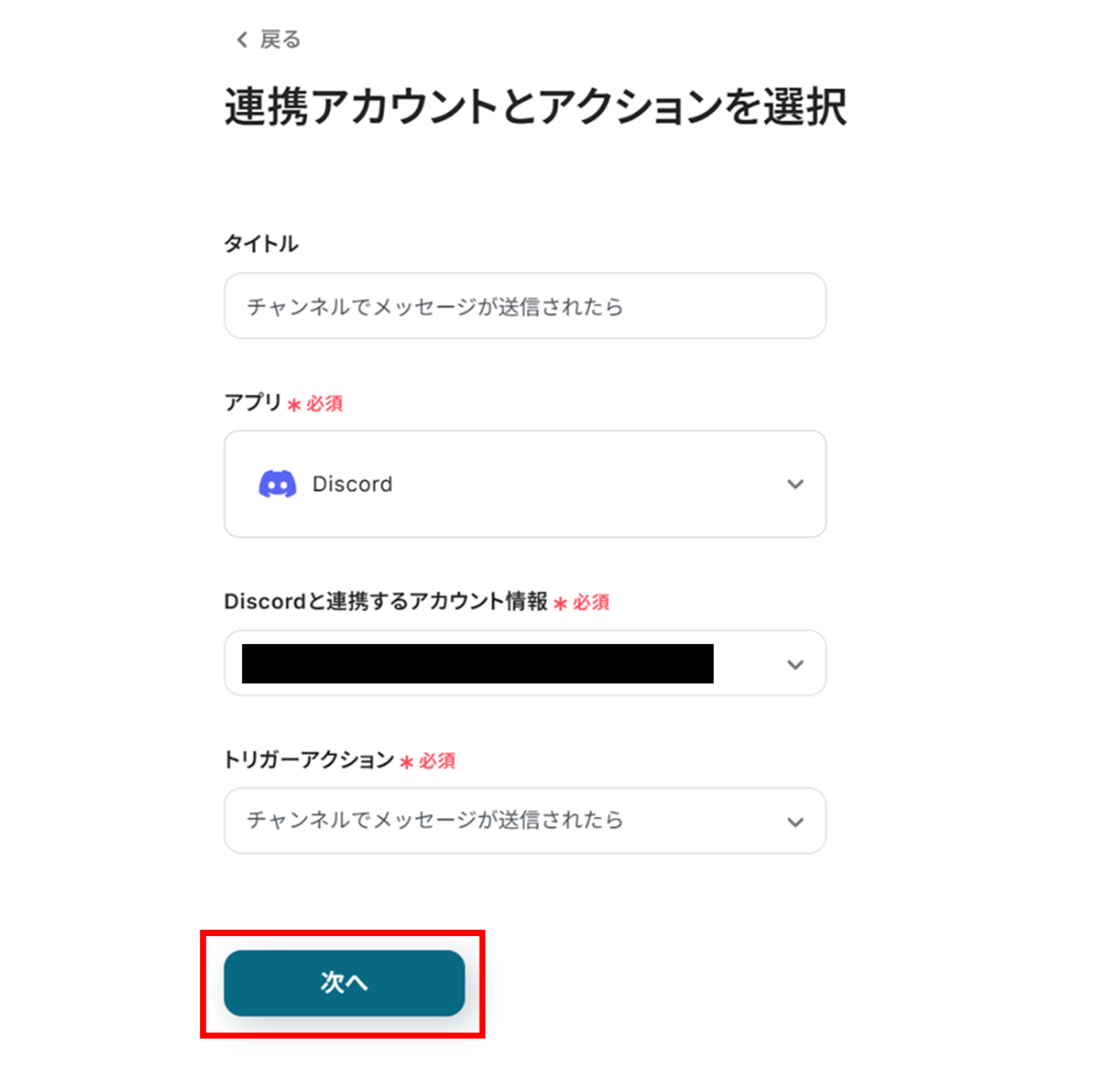 (2)Discordの「連携アカウントとアクションを選択」画面から、Discordと連携するアカウント情報に誤りがないかを確認し、トリガーアクションは「チャンネルでメッセージが送信されたら」のままで「次へ」をクリックします。