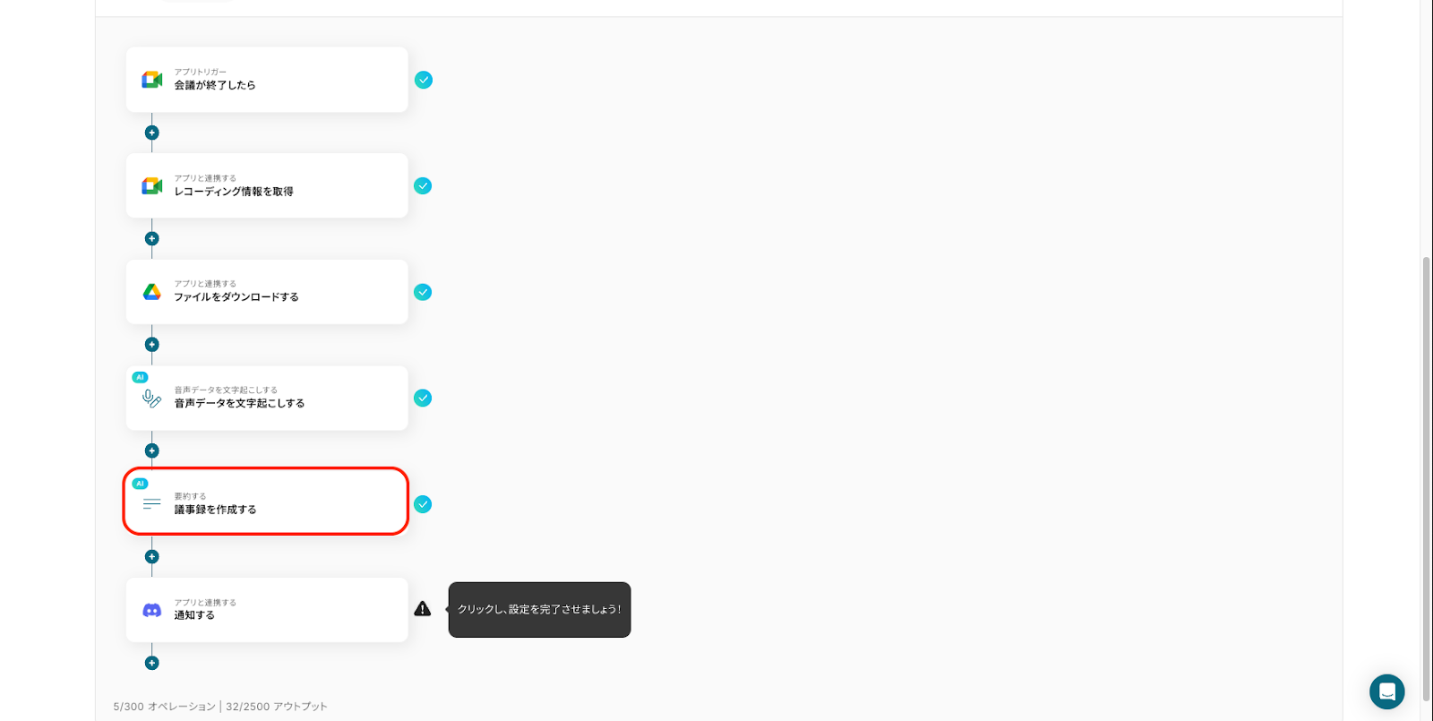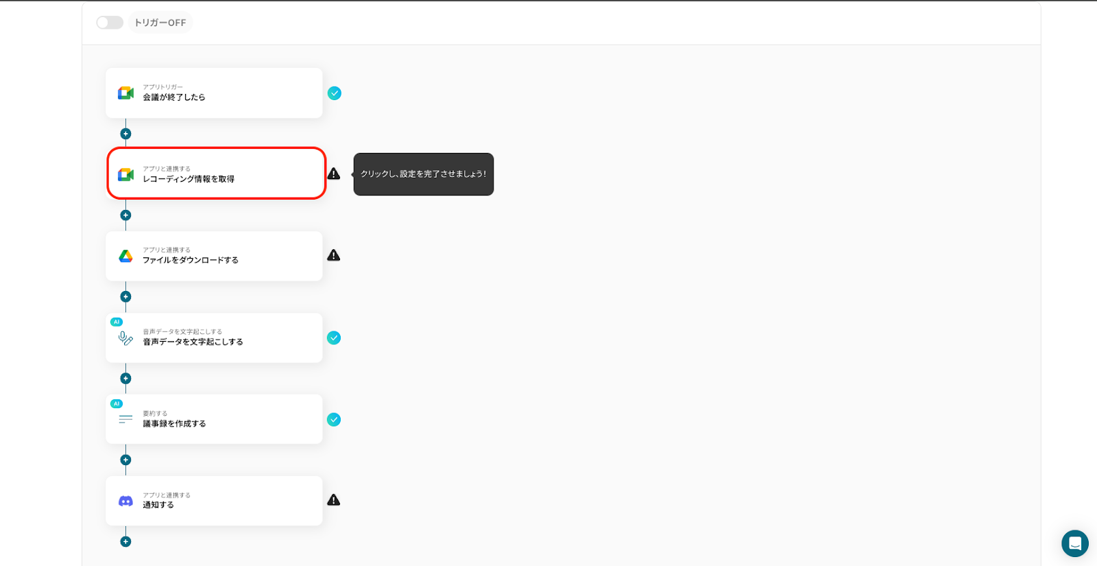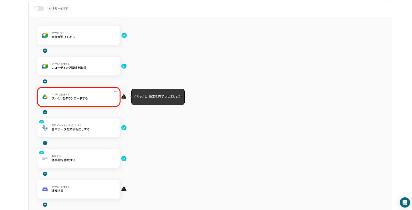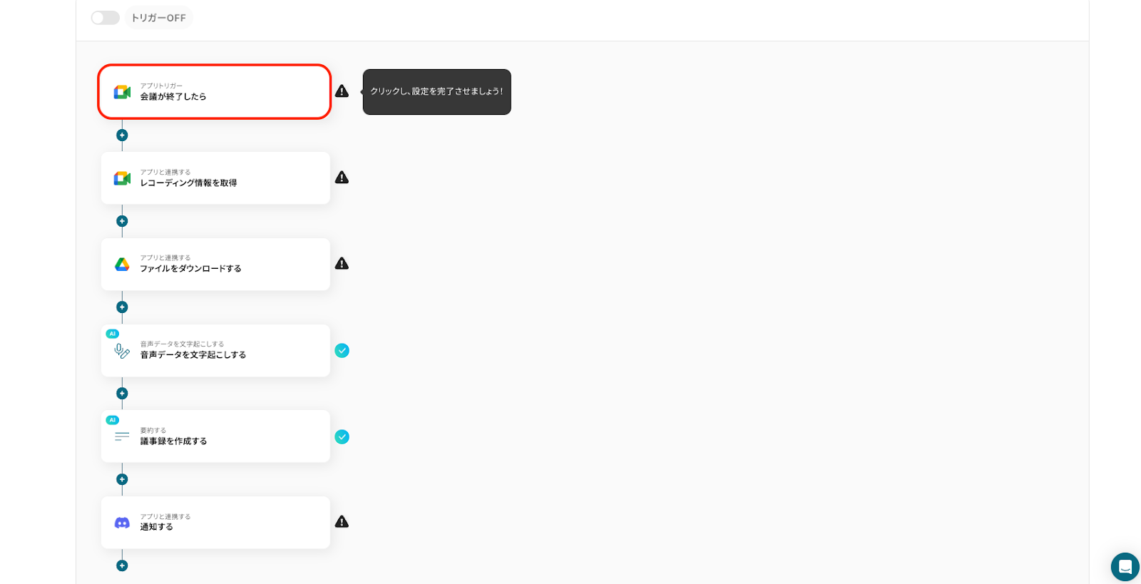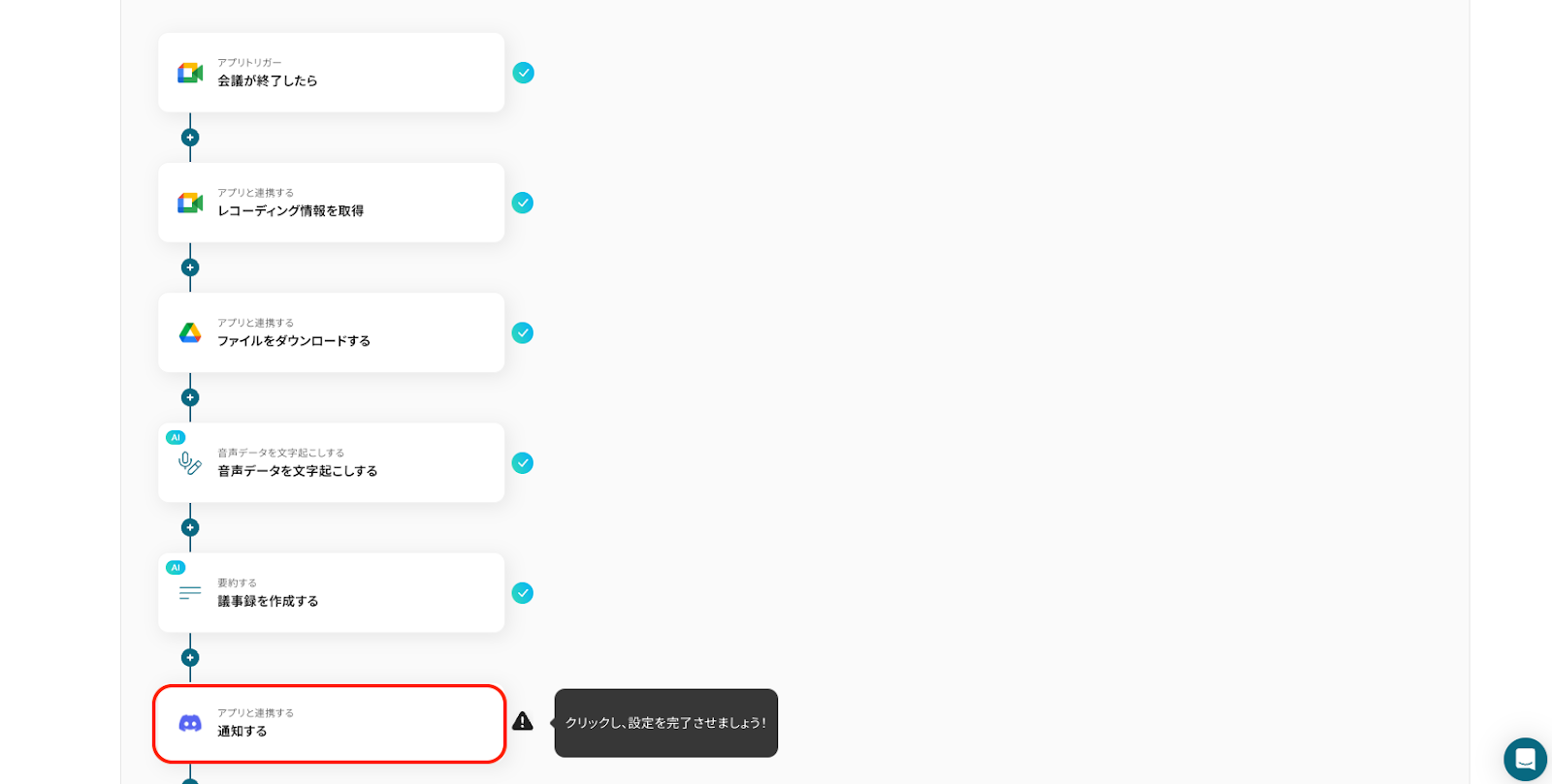 このフローでは、Google Meetの音声を自動でテキスト化し、議事録としてまとめた後、Discordに自動通知します。これにより、手作業での議事録作成や情報共有の手間を省き、効率的に会議内容をチームと共有することが可能です。