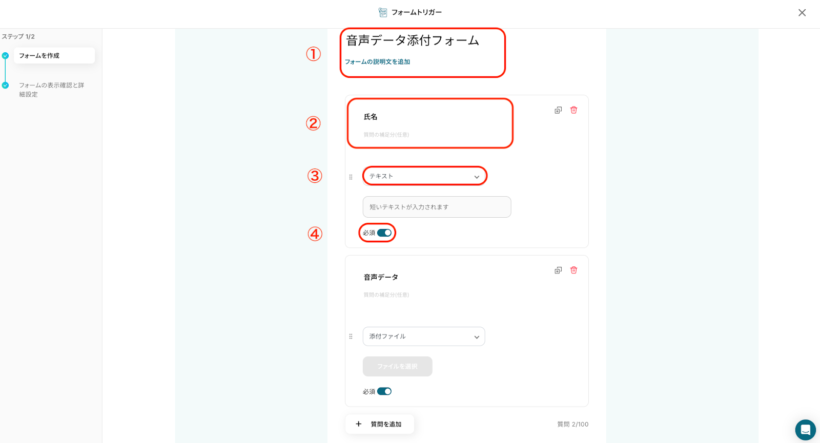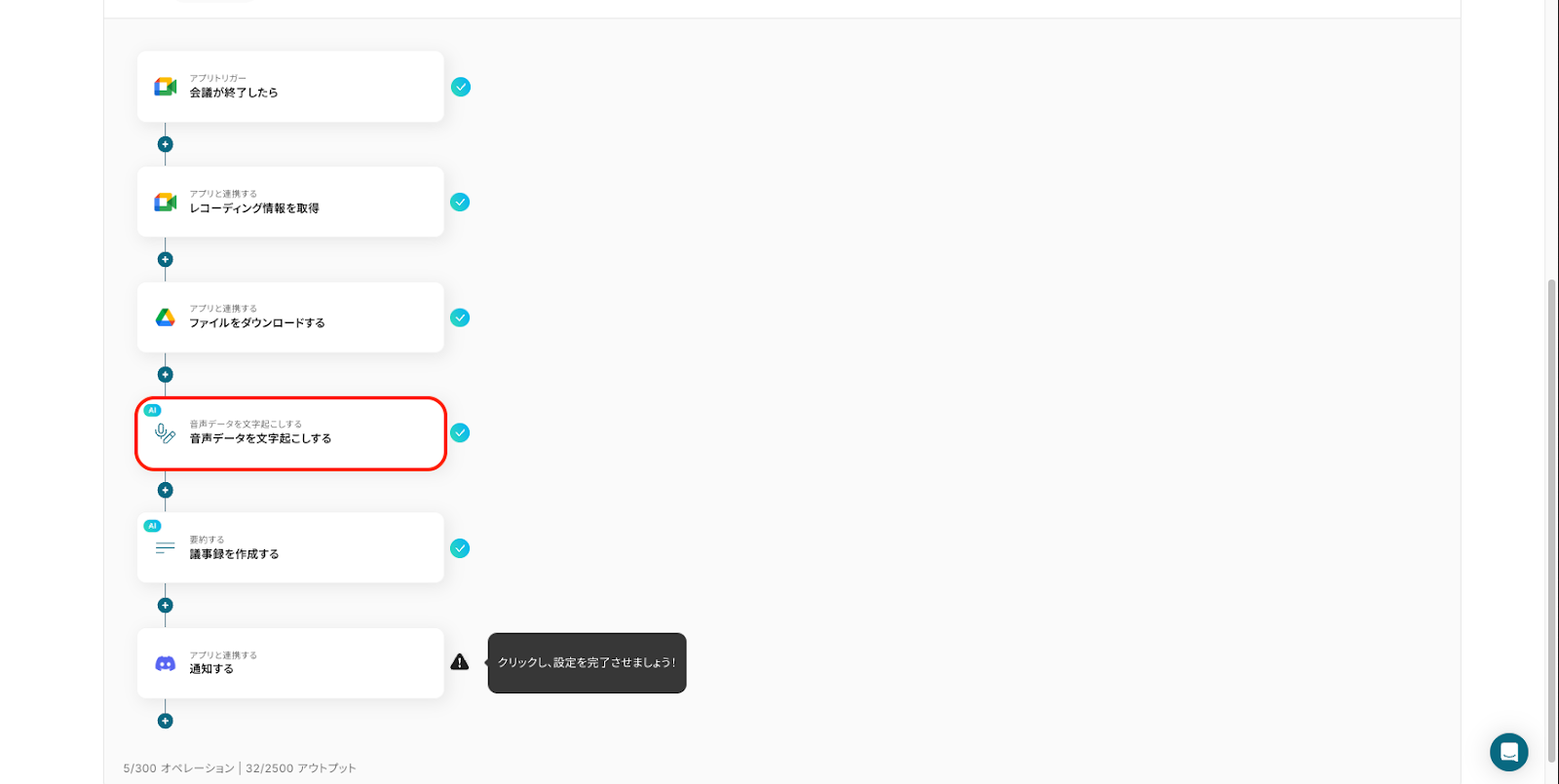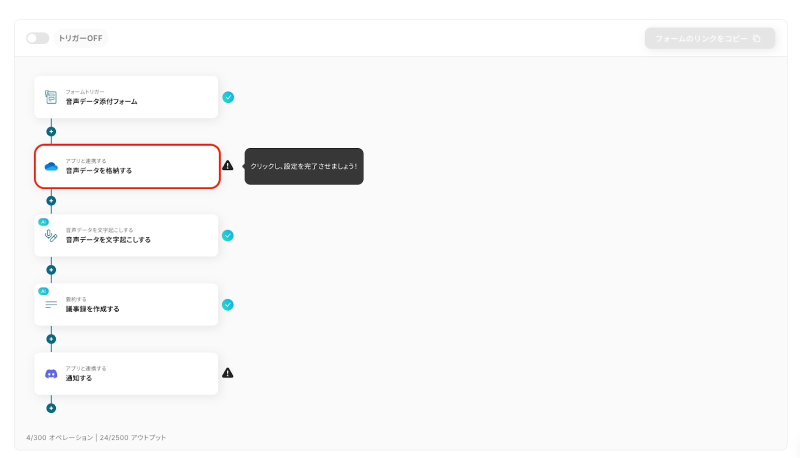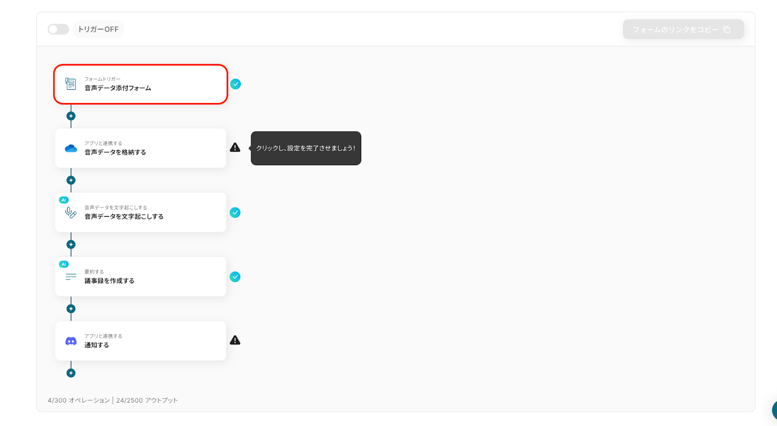 音声データを文字起こしするステップから同じなので、それ以前のフォームの設定から説明します。