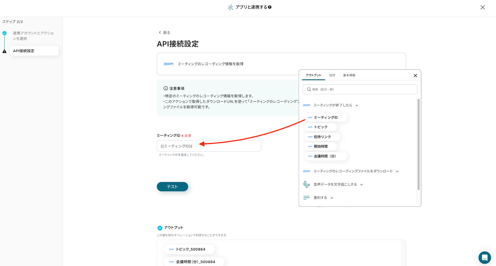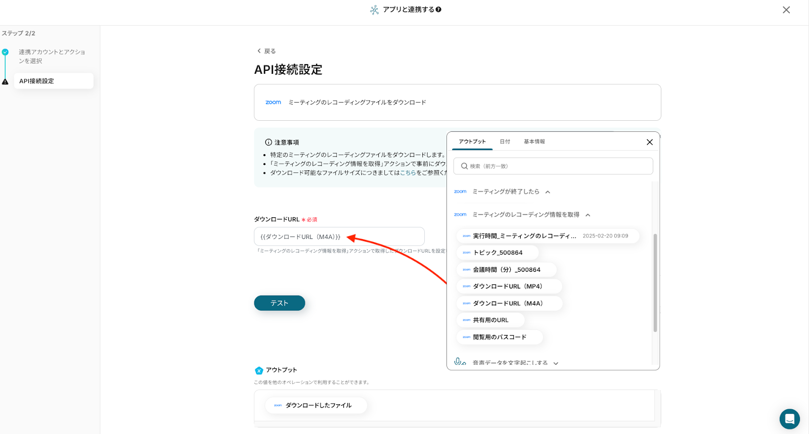 「ダウンロードURL」の入力欄をクリックし表示された候補からZoom(ミーティングのレコーディング情報を取得)のダウンロードURL(MP4)を選択し、「テスト」をクリックしてください。
