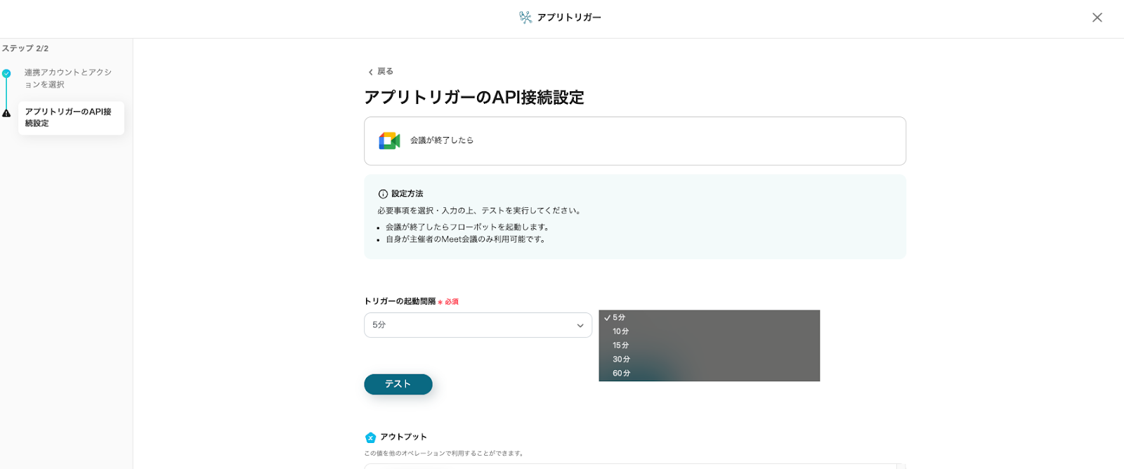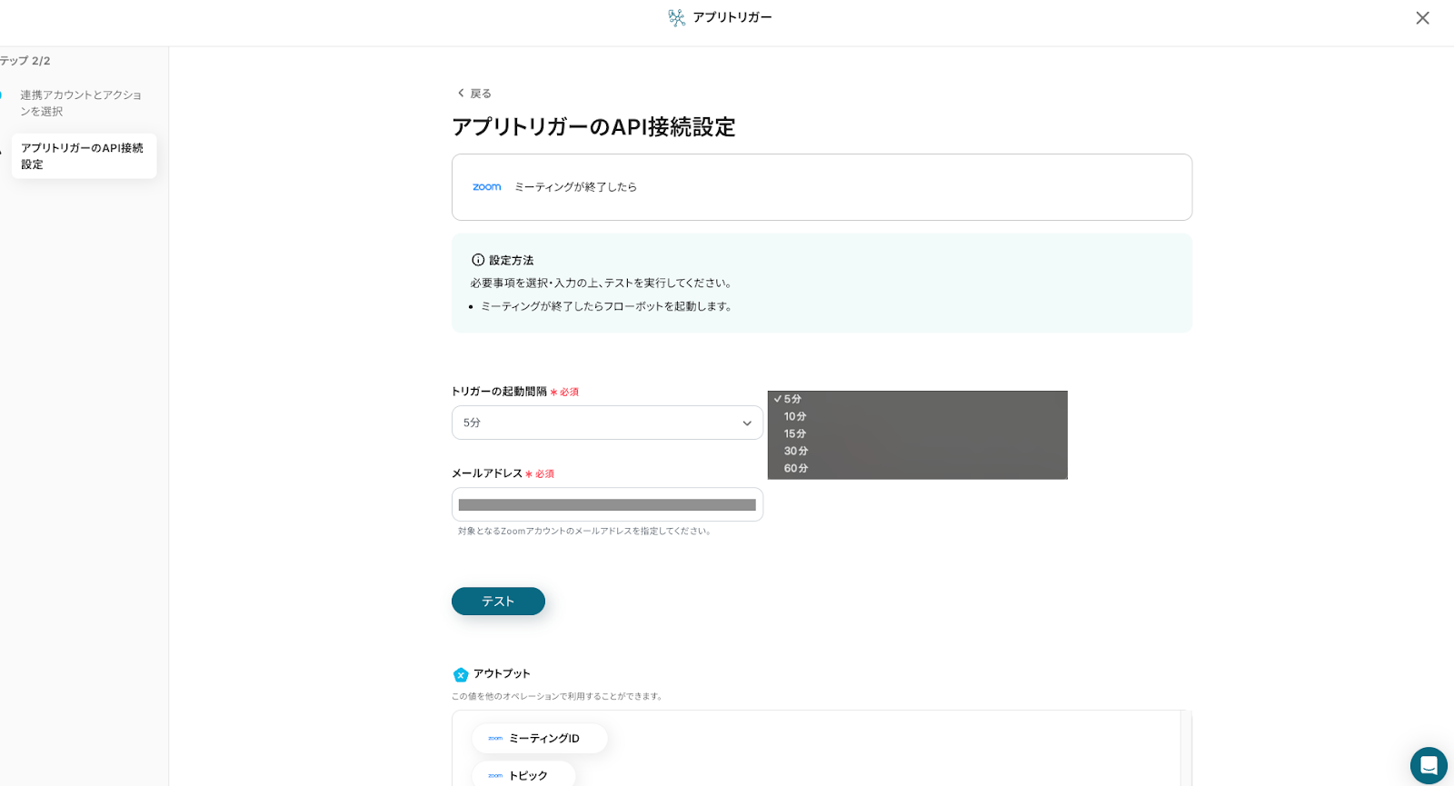 「トリガーの起動間隔」は5分、10分、15分、30分、60分から選択できます。