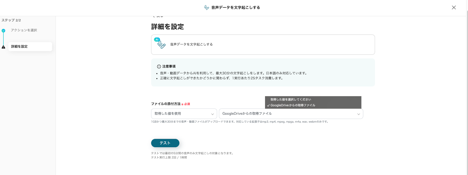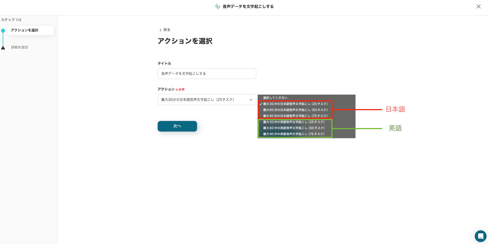 アクションは音声データの長さや元言語に基づいて選択してください。
