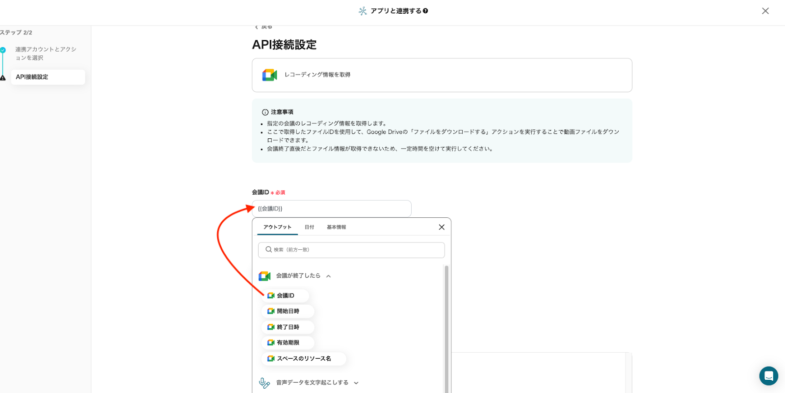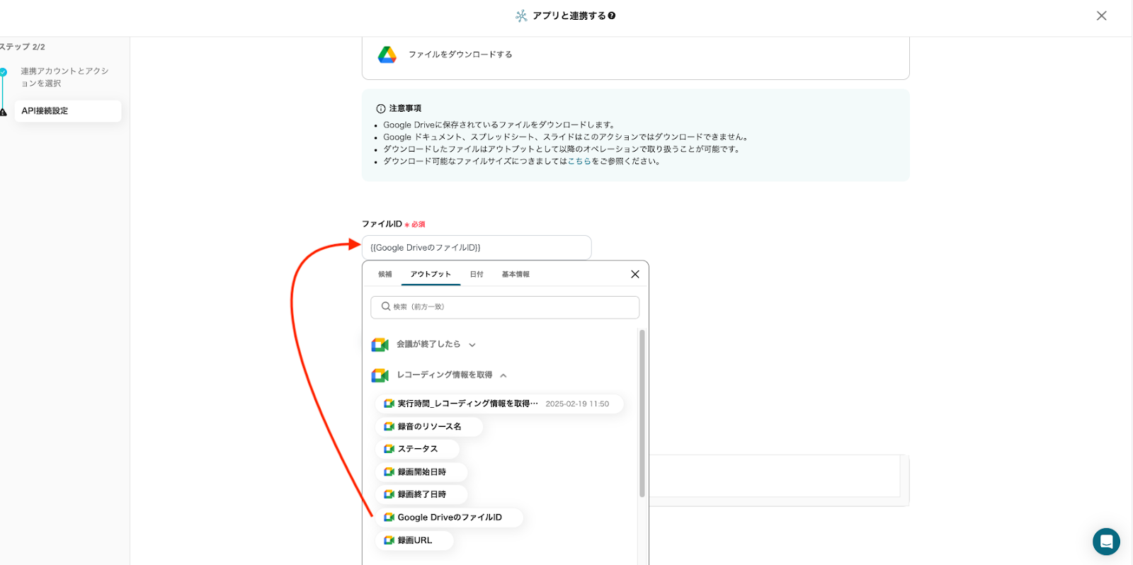 「ファイルID」の入力欄をクリックし表示された候補からGoogle Meet(レコーディング情報を取得)のGoogle DriveのファイルIDを選択してください。