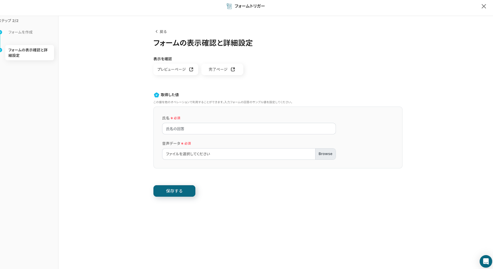 テスト用に「氏名」と「取得した値」を設定し「保存する」をクリックしてください。