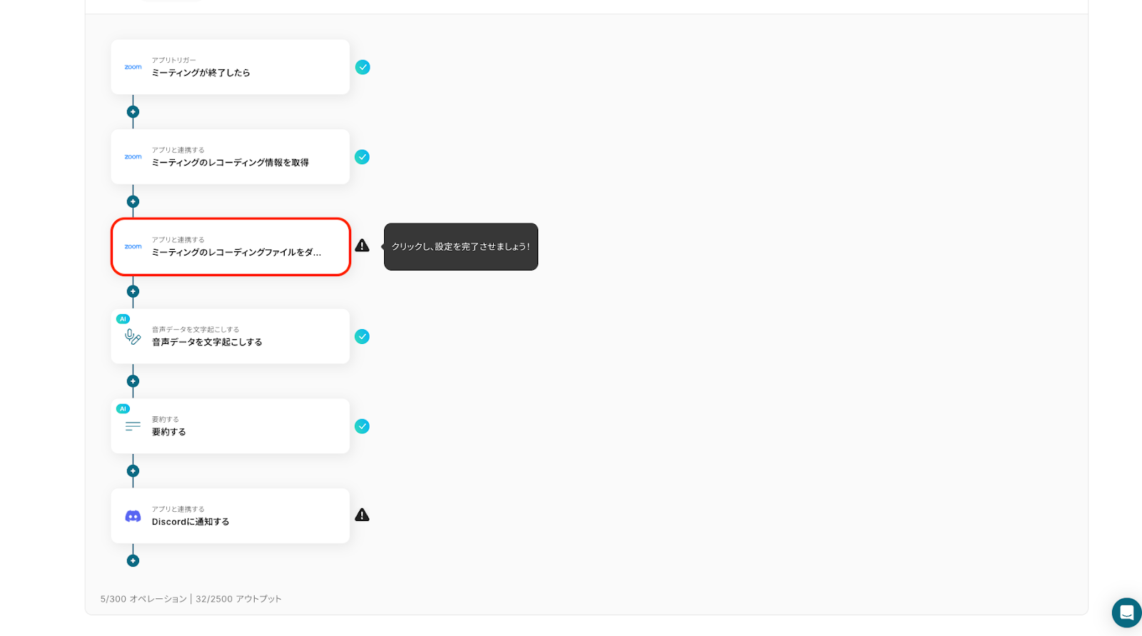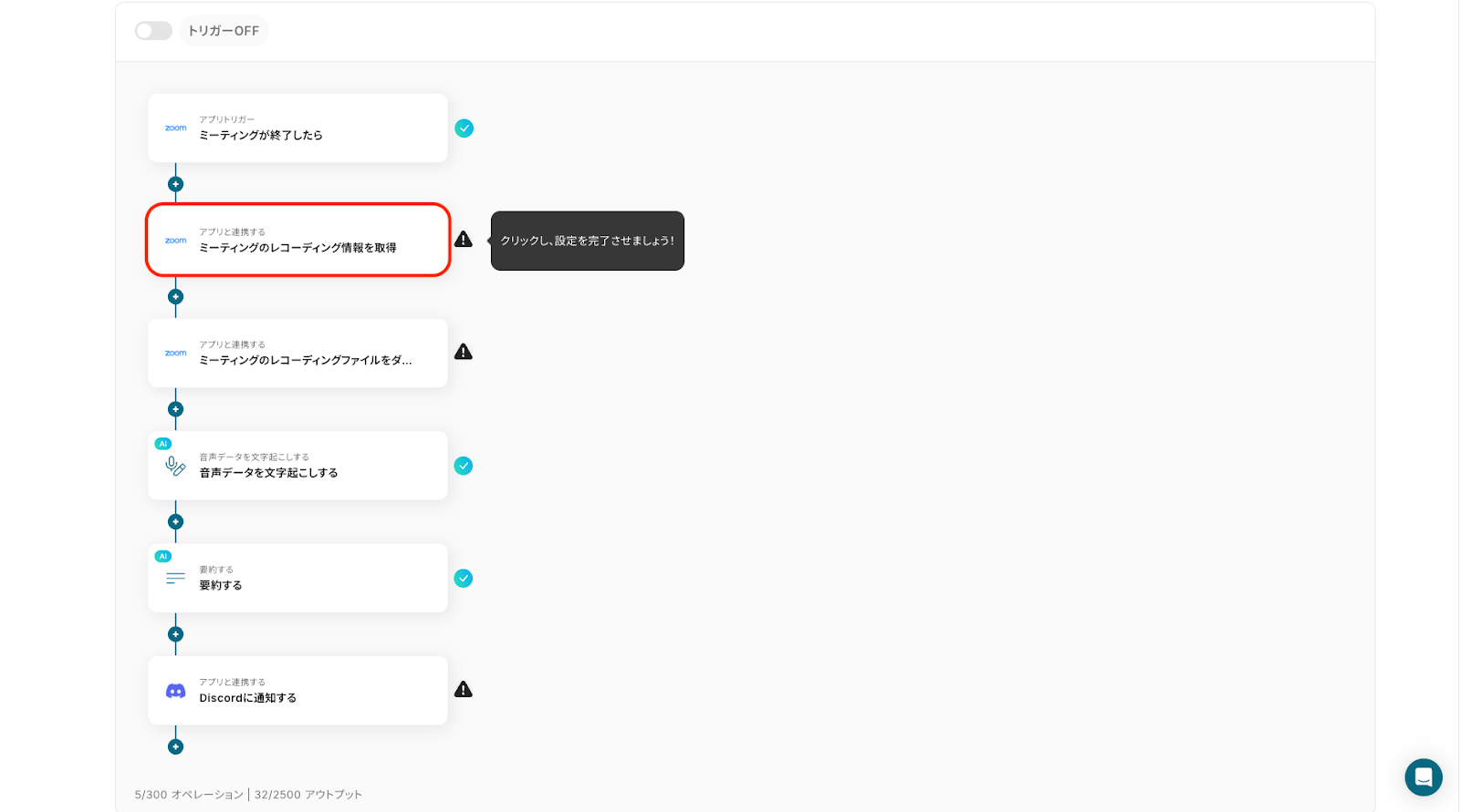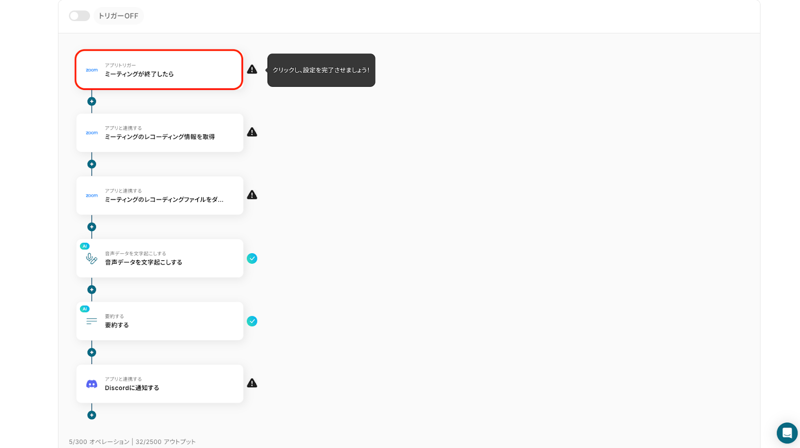 Zoomでミーティングが終了したら自動的に会議内容を自動で文字起こしと要約をして、文字起こしの結果をDiscordに通知するフローです。