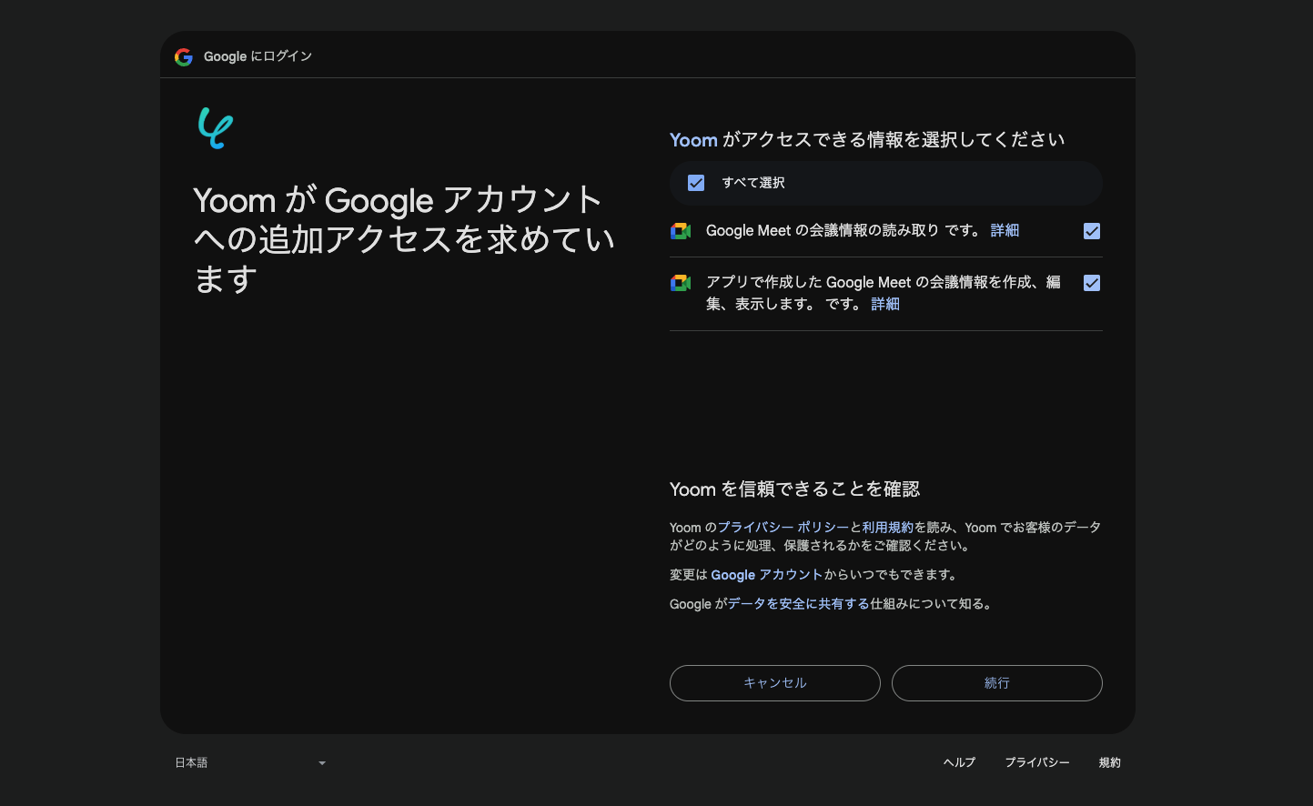 サインイン操作を進めると「YoomがGoogle アカウントへの追加アクセスを求めています」と表示されます。