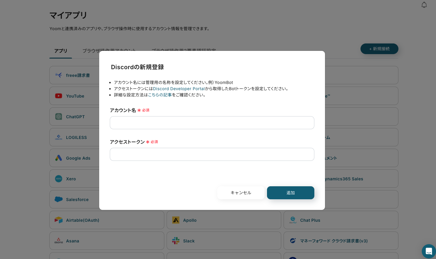 設定後に「追加」をクリックすると、Discordのマイアプリ連携が完了します。