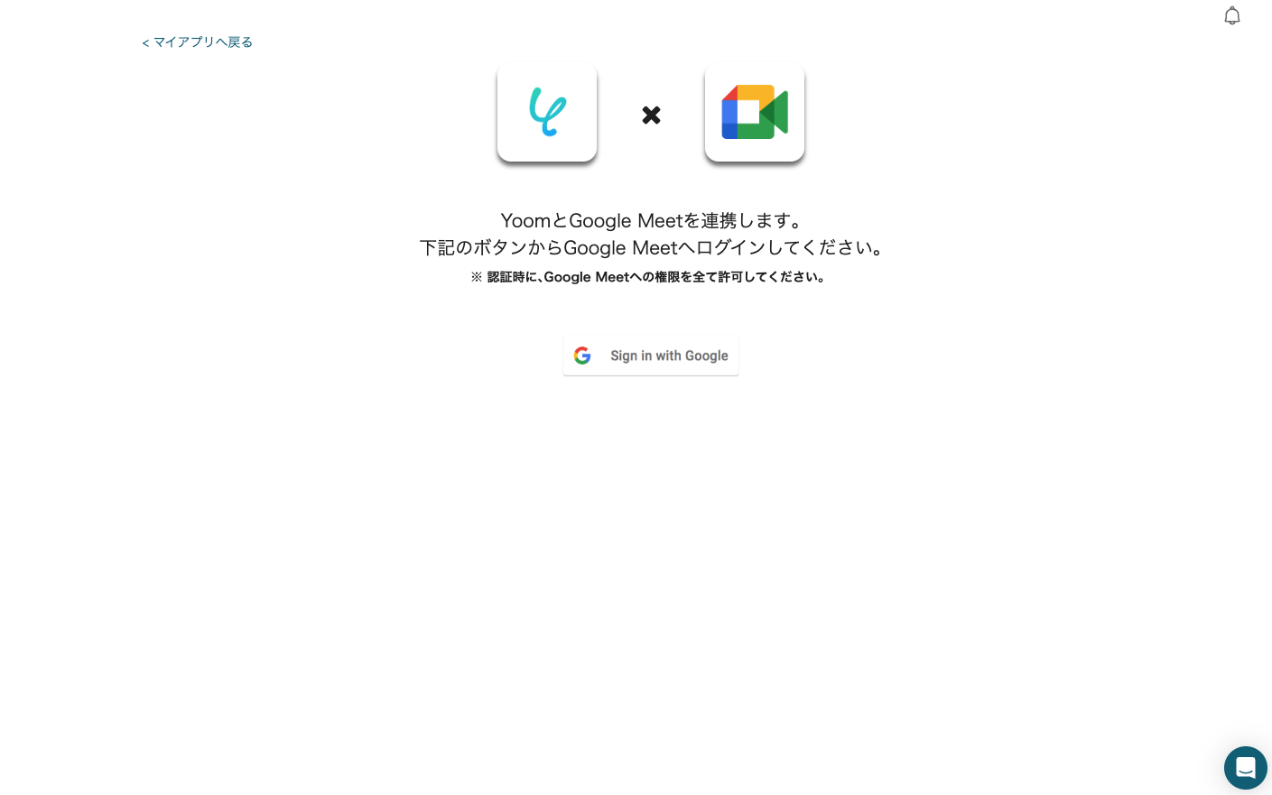 Yoomにログイン後、ページ左側にある「マイアプリ」をクリックし「+新規接続」からGoogle Meetを検索してください。