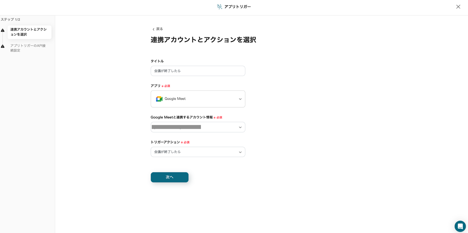 タイトルは編集可能ですが、トリガーアクションは変更せず「次へ」をクリックしてください。