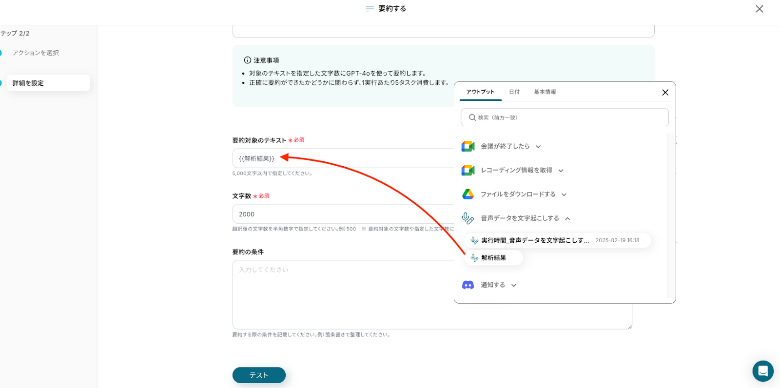 「文字数」と「要約の条件」は任意で設定できます。設定する場合は注釈を参照してください。