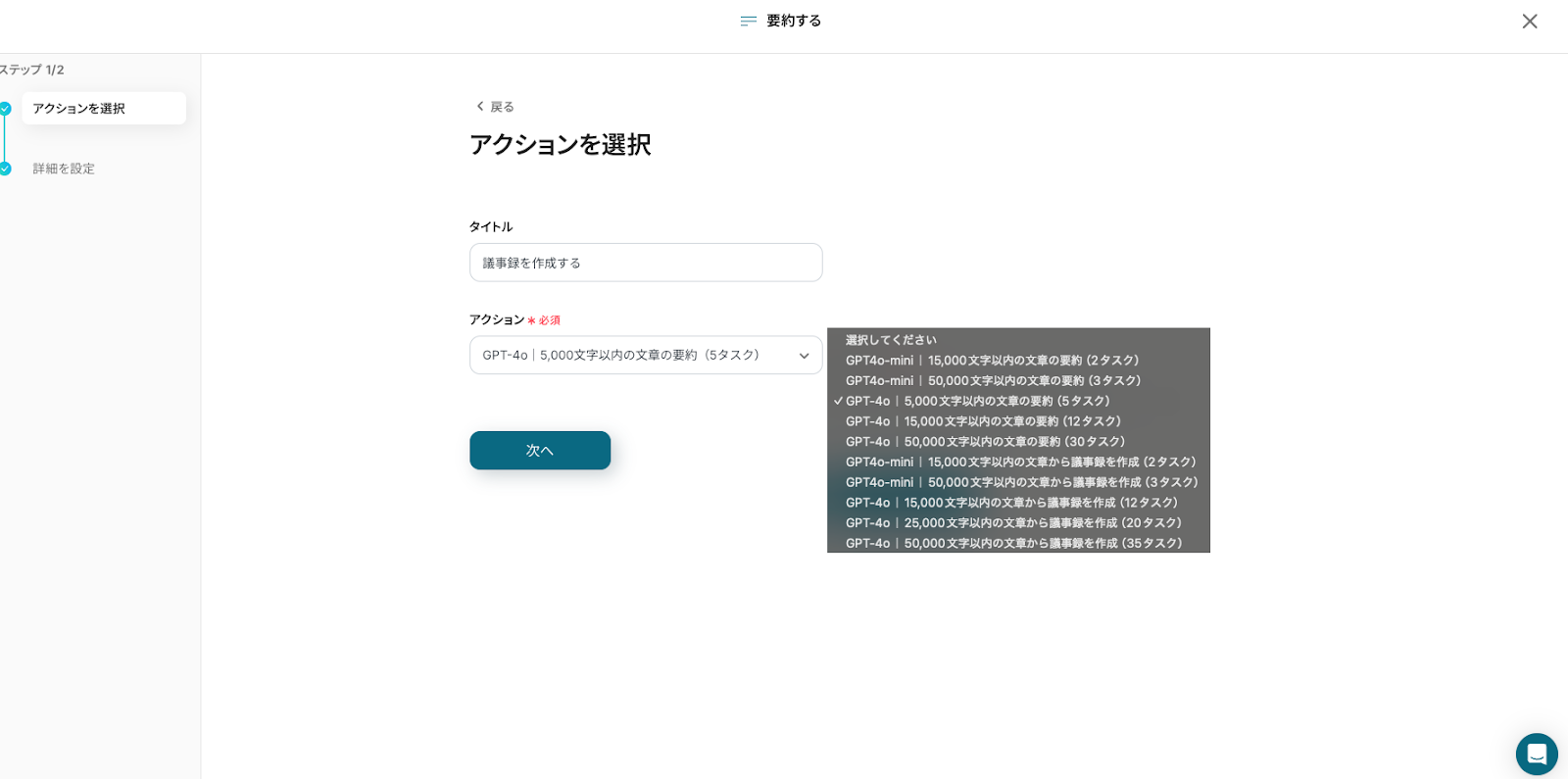 アクションは、ChatGPTのモデルを選択できます。※()内の消費タスク量にご注意ください。