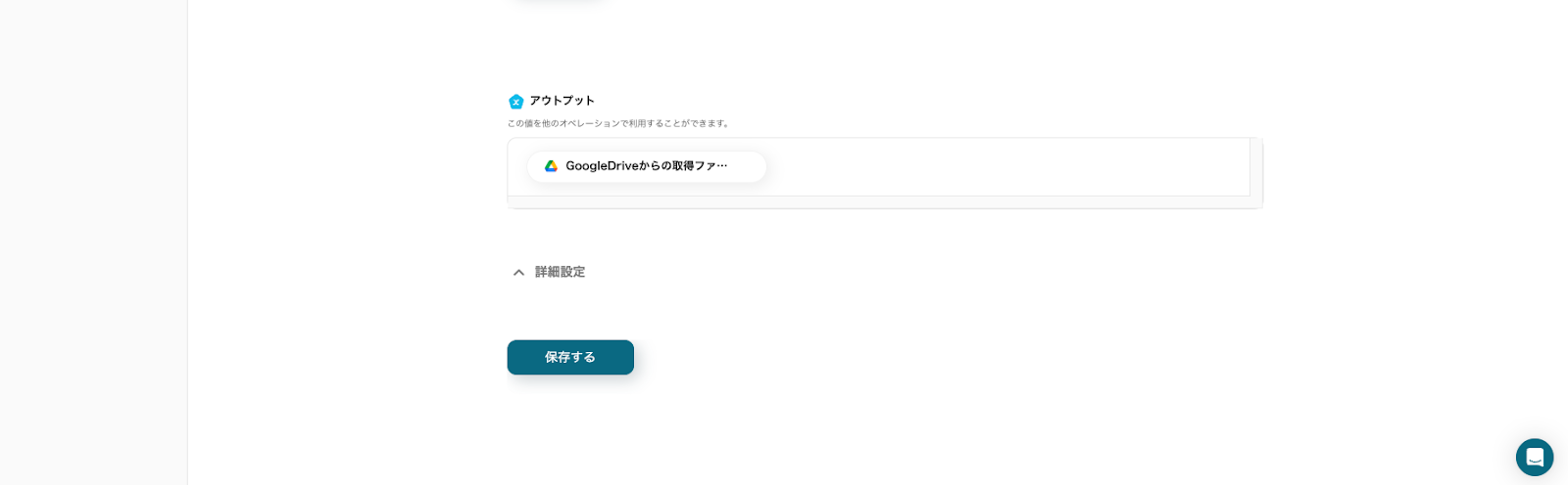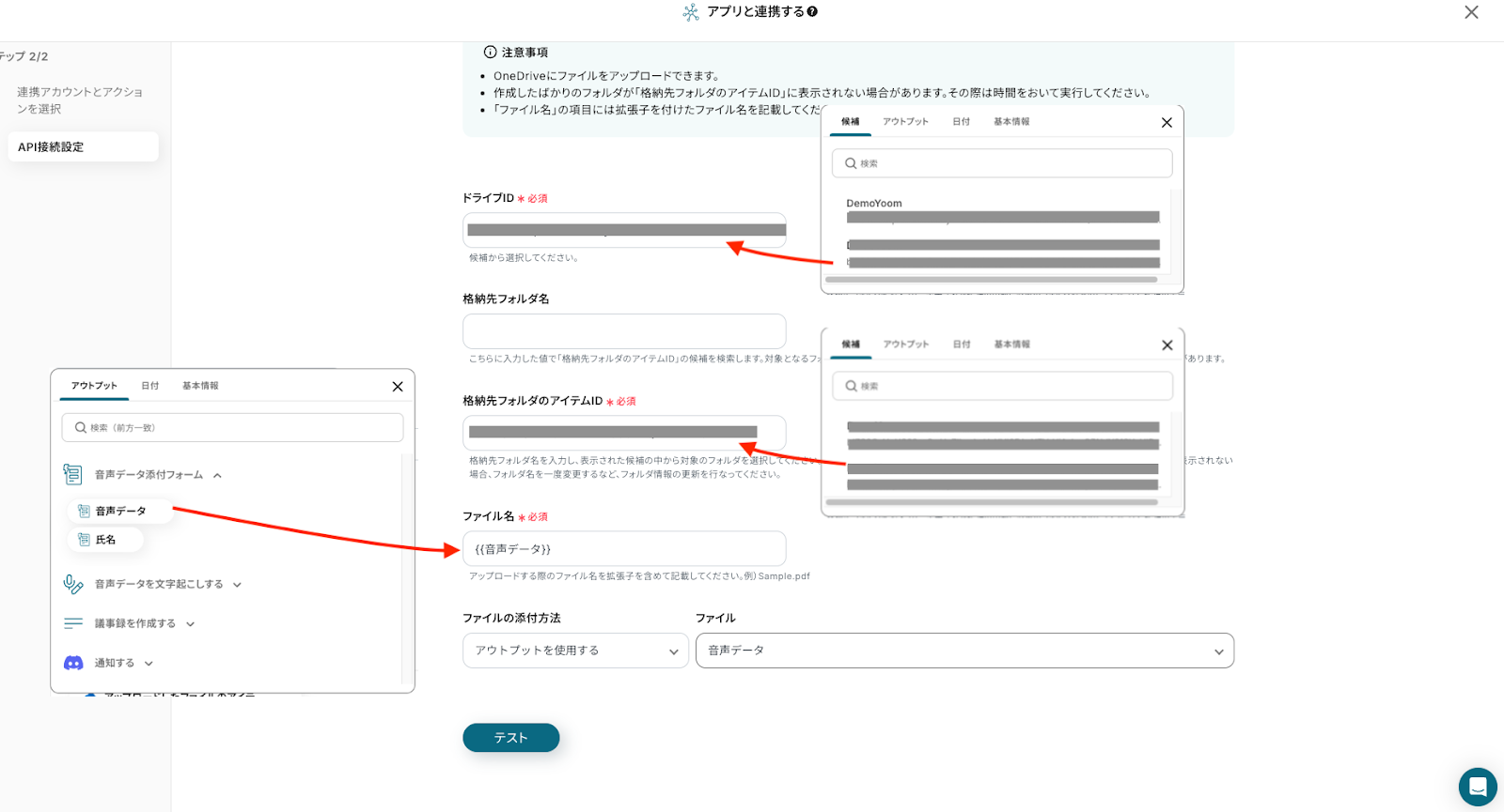 「ドライブID」と「格納先フォルダのアイテムID」は、入力欄をクリックし表示された候補から選択してください。