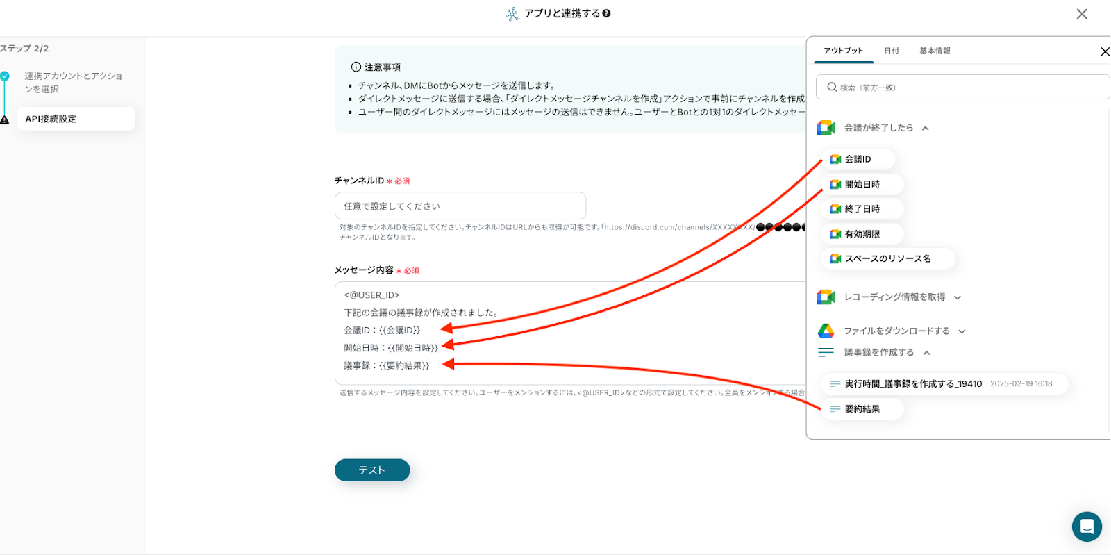 「メッセージ内容」は任意で編集できます。今回は「ユーザーへのメンション、会議ID、会議日時、要約結果」の構成でメッセージを作成しました。なお、注釈通りユーザーをメンションするには<@USER_ID>などの形式で設定してください。