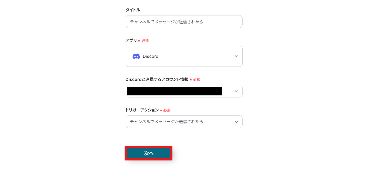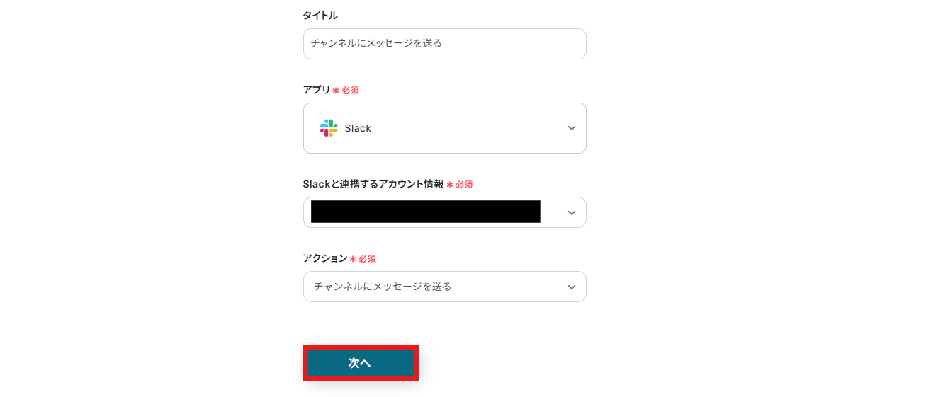トリガーは「チャンネルでメッセージが送信されたら」を選択します。設定が終わったら「次へ」をクリックします。
