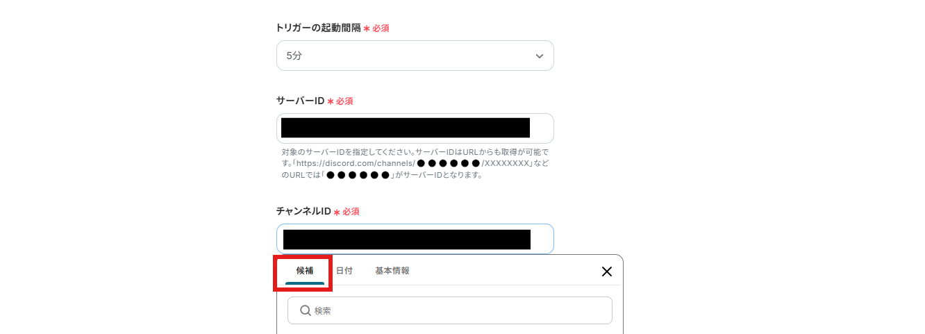 チャンネルIDは、入力欄をクリックすると候補が表示されるので、その中から選択してください。