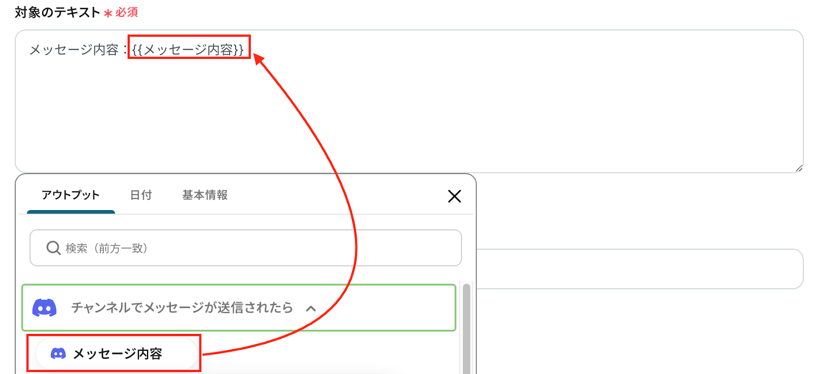 続いて、「詳細を設定」画面から任意の文字列の抽出設定を行います。今回はメッセージから顧客データを抽出するため、アウトプットよりメッセージを挿入しましょう。