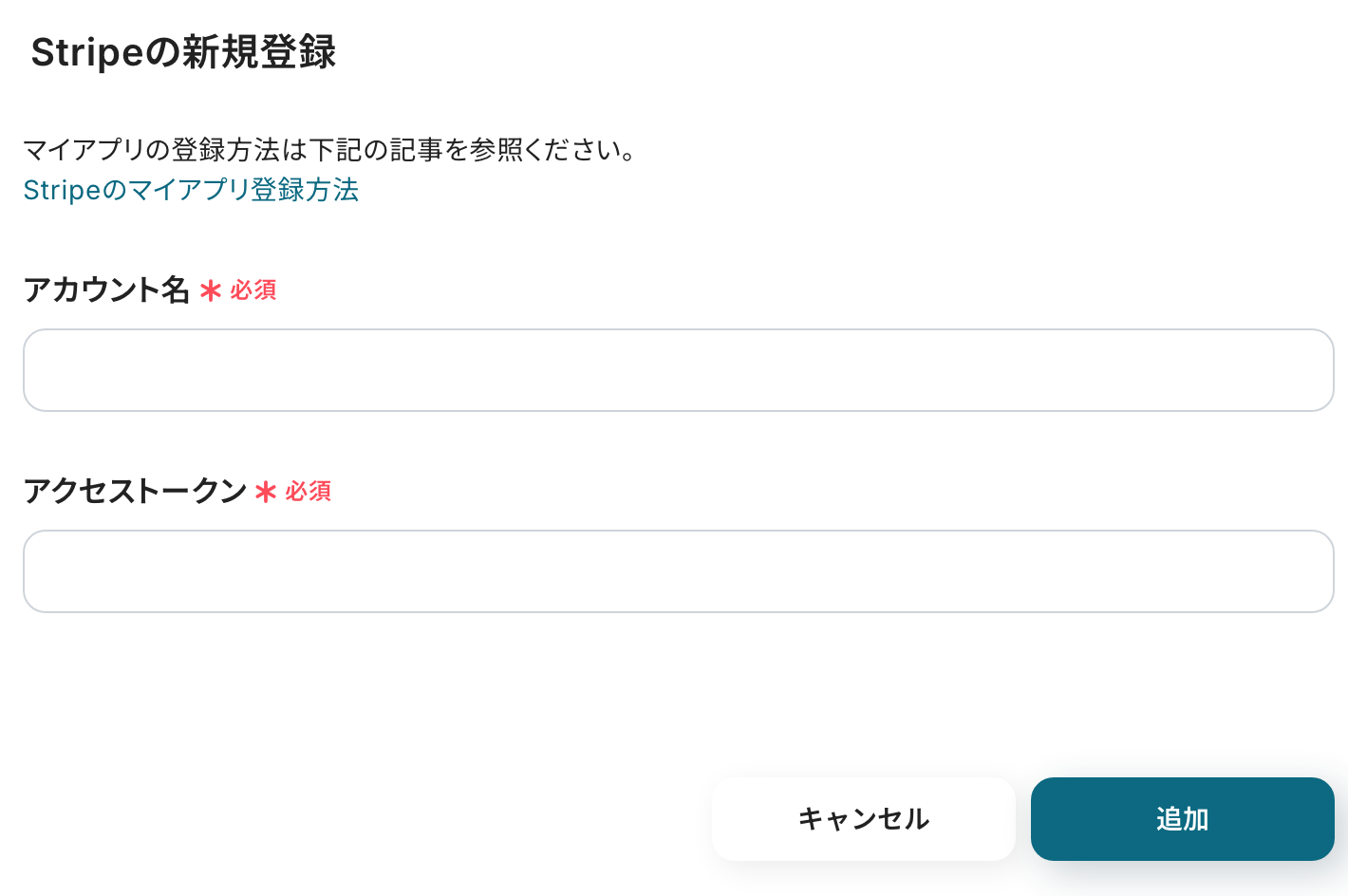 以下の画面が表示されたら、設定方法の詳細をご覧いただき、アカウント名とアクセストークンを入力し、「追加」をクリックします。