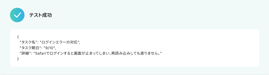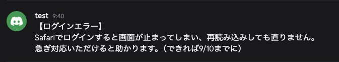 今回はユーザーからエラー報告が投稿された状況を想定して、テスト用に以下の内容で送信しました。