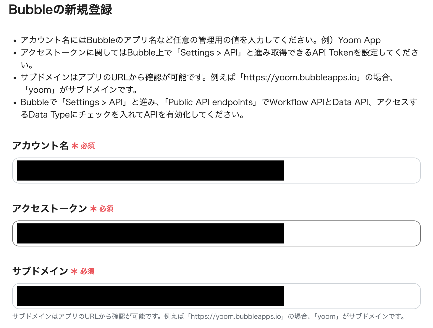 以下の画面が表示されるので、注釈に沿ってアカウント名、アクセストークン、サブドメインを入力し、「追加」をクリックします。