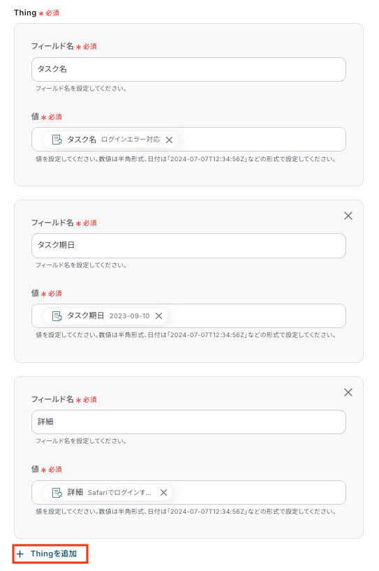 さらに項目を追加したい場合は、画面下部の「+Thingを追加」(画像赤枠部分)をクリックすることで新しいフィールドを追加できます。