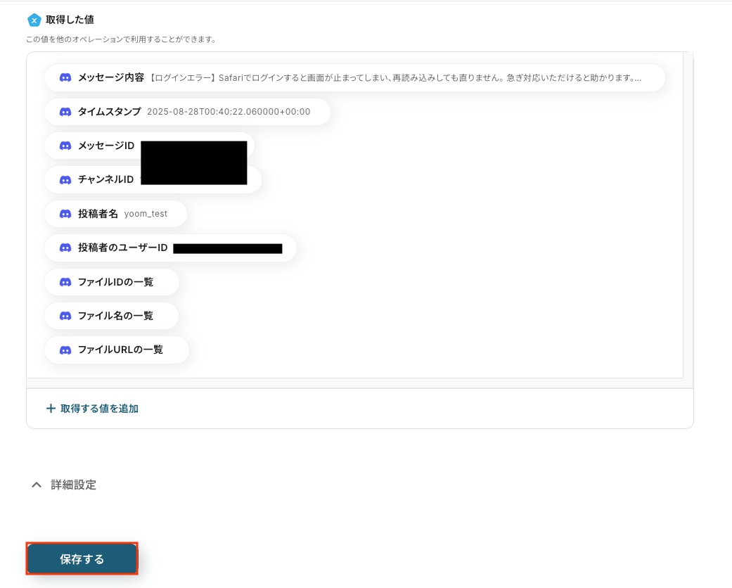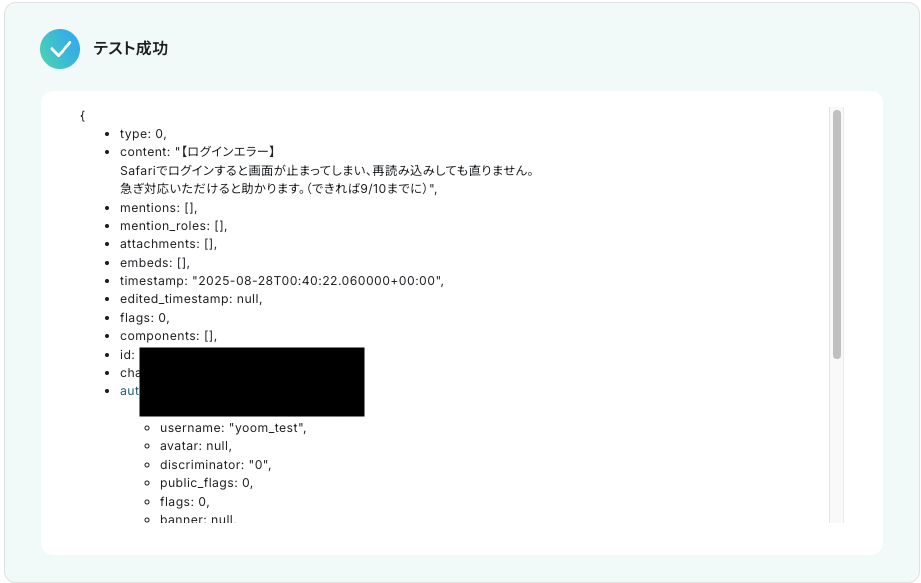 テストに成功すると、Discordに送信されたメッセージに関する情報が一覧で表示されます。