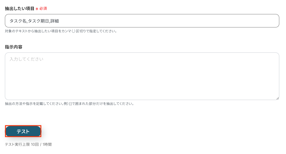 例えば、指示内容を入力する部分に「本文冒頭にある内容を抽出してください」など情報の位置を指定したり、「画像URLは除外してください」のような不要な情報を除外する条件を入れることも可能です。