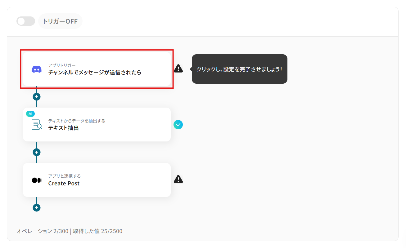 フロー画面に戻り、「全ての設定が完了しました!」と表示されていればフローの設定は完了です。 早速フローを稼働させるのであれば、「トリガーをON」をクリックします。