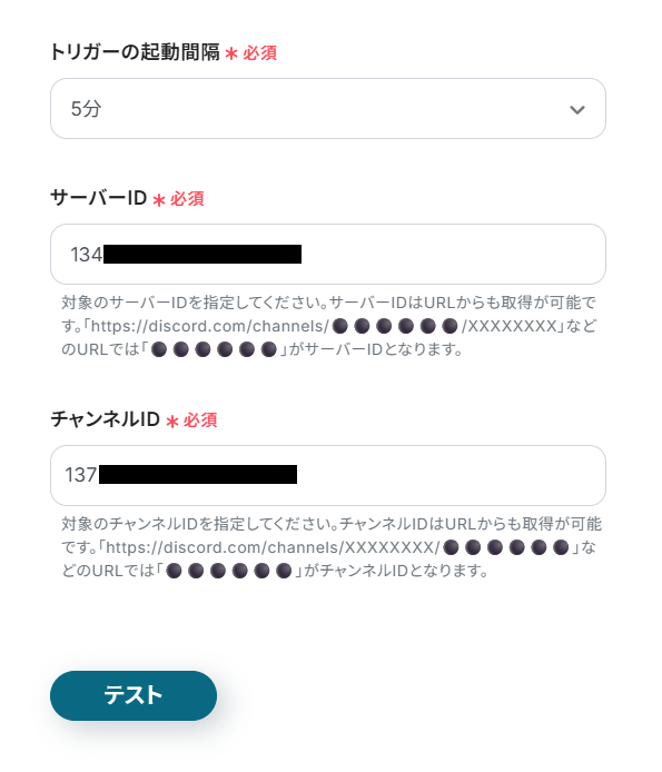 「チャンネルID」に、メッセージを送信するチャンネルのIDを設定。 チャンネルIDはDiscordチャンネルのURL(discord.com/channels/サーバーID/チャンネルID )で確認できます。