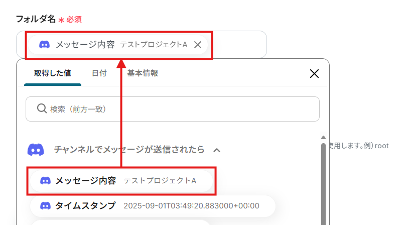 「フォルダ名」に任意の重複しないフォルダの名前を設定。入力欄クリック時に表示される「取得した値」タブのトリガーアクションメニューから、メッセージ内容を選択してください。 日付タブから任意の形式の日付を追加したり、固定テキストと組み合わせたりすることも可能です。