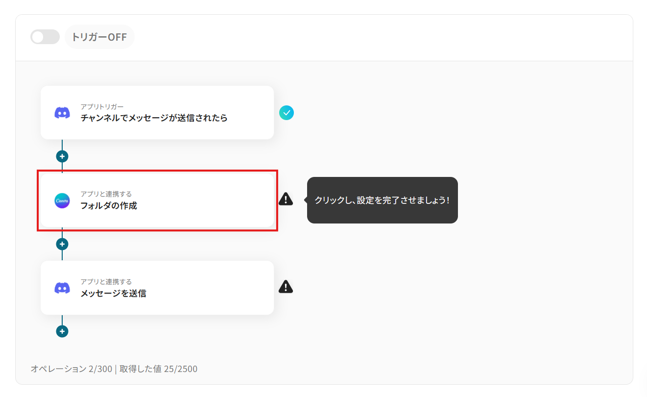Discordのトリガー設定と各アクション(フォルダ作成・通知)の設定