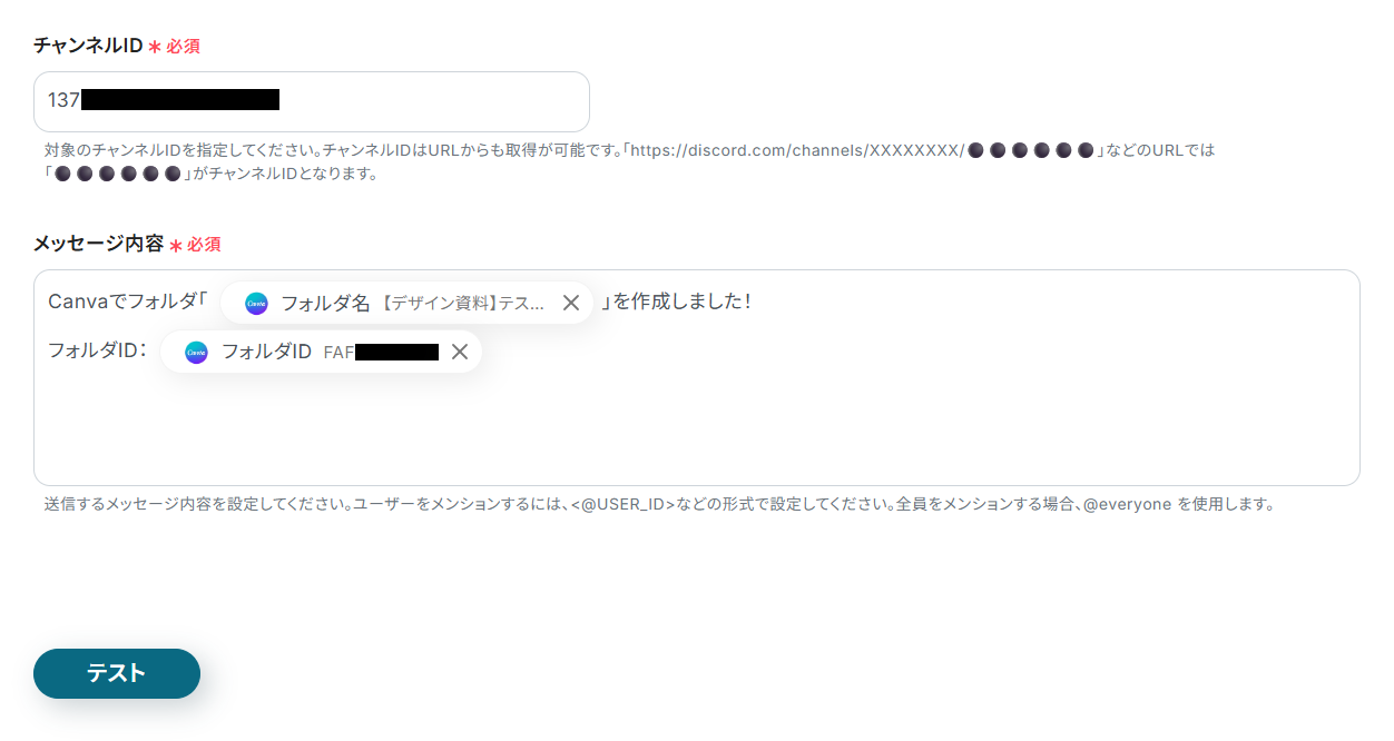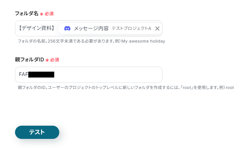 次に、Yoomでの設定テストを行います。テストで必要になるため、Discordの指定したチャンネルにテスト用メッセージを投稿してください。このメッセージがそのままフォルダ名として設定されます。 ※ テスト用メッセージ