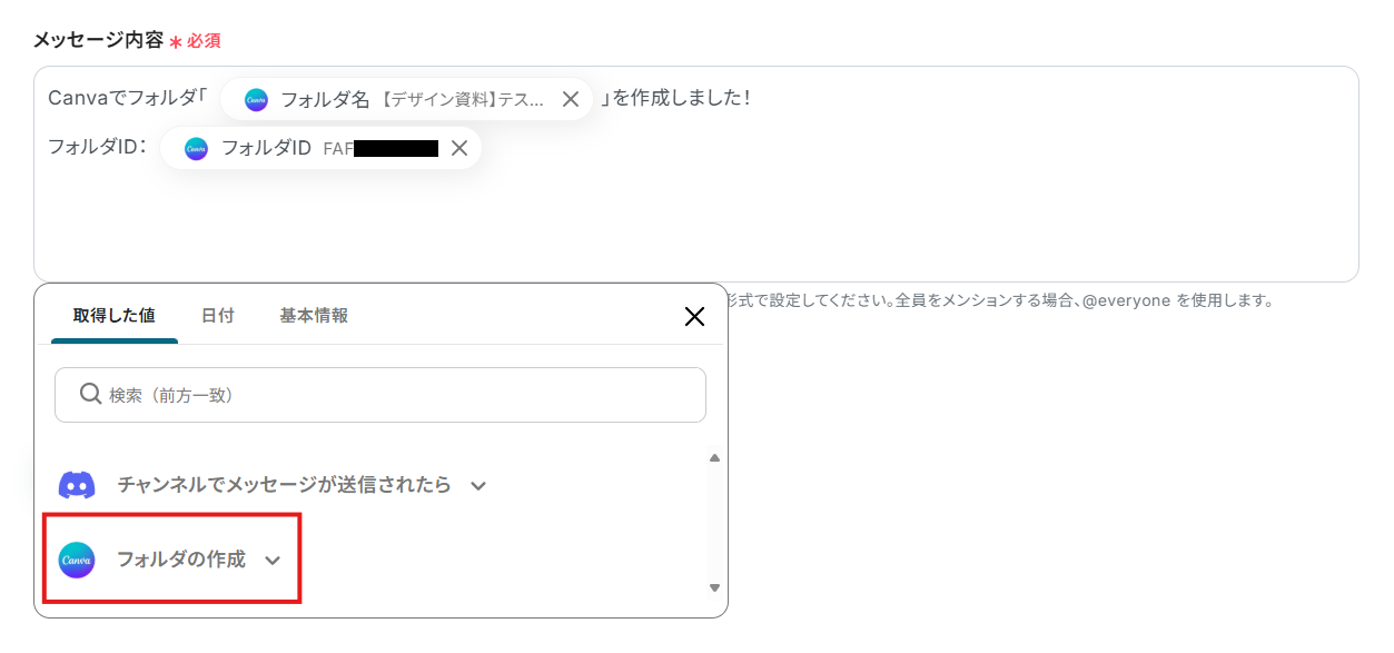 「メッセージ内容」に通知内容を設定。 入力欄クリック時に表示されるフォルダ作成アクションのメニューから、Canvaで作成したフォルダの情報を取得した値から選択してください。このように取得した値を活用することで最新のデータをその都度Discordへ自動送信可能となります。 なお、テキストを直接入力した部分は固定値とされるため、下記画像のように「Canvaでフォルダ『』を作成しました!」などは手入力し、毎回変動することが望ましい「フォルダ名」や「フォルダID」などは取得した値を活用しましょう。