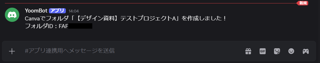 トリガーをONにしたら、実際に動作することを確認しましょう。 Discordの指定したチャンネルにメッセージを投稿し、自動でCanvaにフォルダが作成されてフォルダ情報がチャンネルに投稿されていれば成功です。