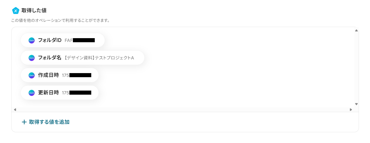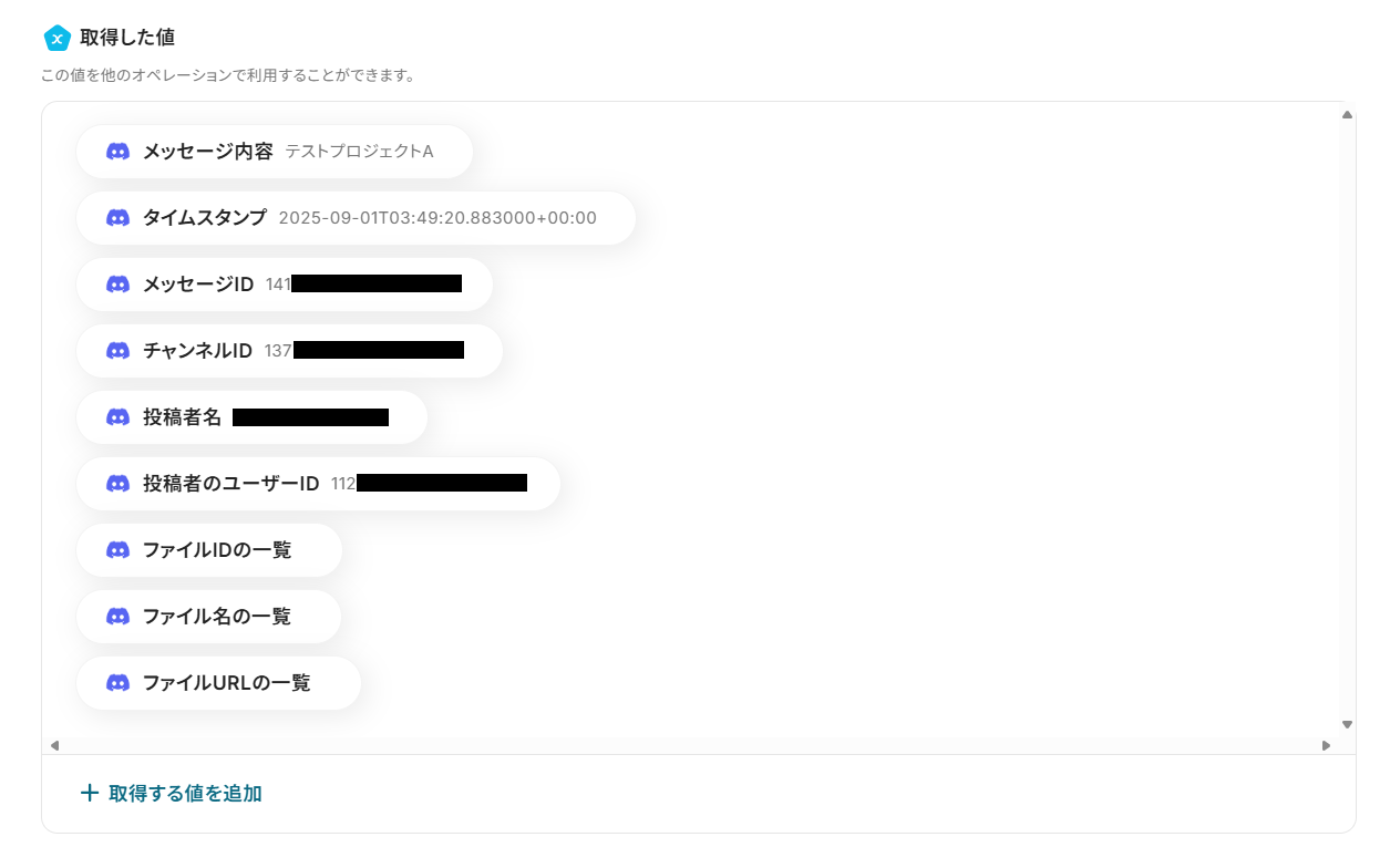 テストに成功すると、「取得した値」にDiscordの最新メッセージの情報が追加されます。 これらの値は、以降のアクションで変数(フローが稼働する度に更新される値 )として使用でき、Canvaに自動登録可能なデータとなります。 詳しい説明は、こちらのヘルプページ をご覧ください。