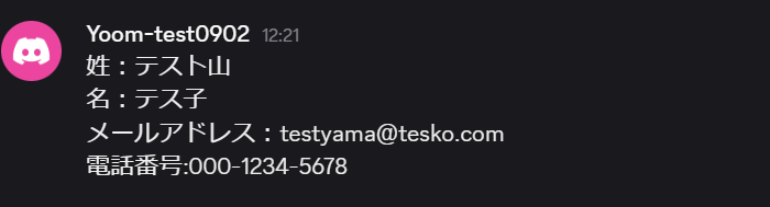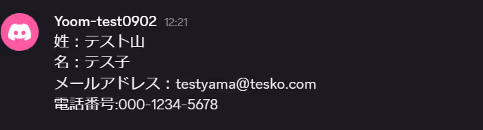 Discordにテストメッセージを送信できたら、Yoomの設定画面に戻って「テスト」ボタンをクリックしてみましょう。