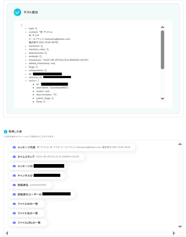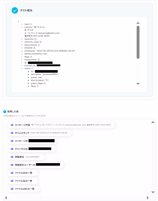 「テスト成功」の文字とリクエスト内容がJSON PATHで表記され、共に「取得した値」として、Discordに送信したメッセージの内容が反映されていれば成功です!