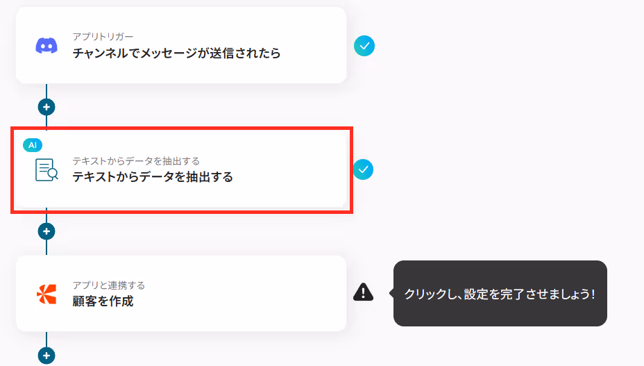 Discordで送信されたメッセージをYoomが検知したら、その内容からChargebeeに連携させる情報を抽出するために、YoomのAIオペレーションを設定していきます。