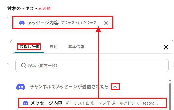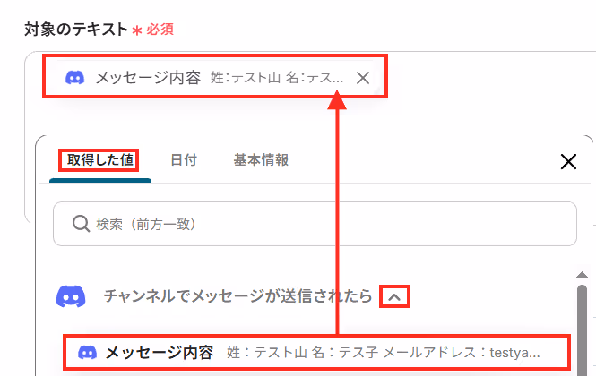 AIが情報を抽出する「対象のテキスト」を設定します。アプリトリガーで取得した値であるDiscordのメッセージ内容を設定しましょう。