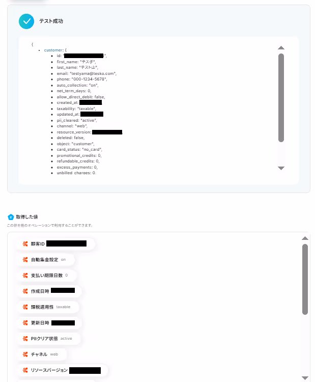 Chargebeeに顧客として作成する情報を、「取得した値」から設定していきましょう。この例では、以下4つの項目を前ステップで取得した値から設定できますね。