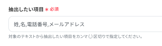 次に、対象のテキストから抽出したい項目をカンマ区切りで手入力してください。ここでは以下のように入力しました。